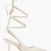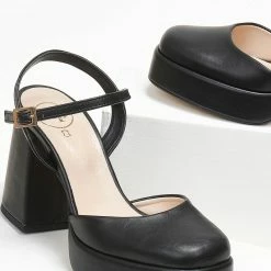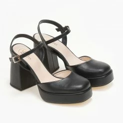 Tfp γόβες σε καρέ γραμμή. Έχουν φιάπα και χοντρό τακούνι. Δένουν στο ύψος του αστραγάλου. Δερμάτινος πάτος. Ελληνικής κατασκευής.