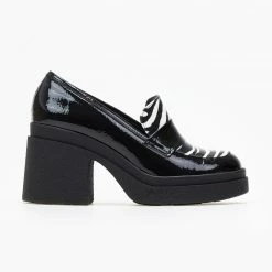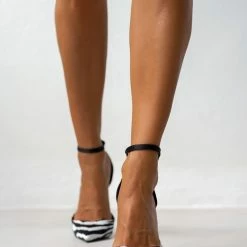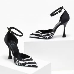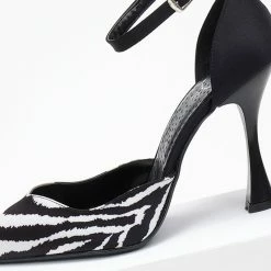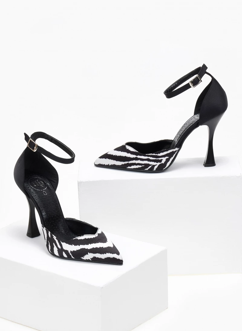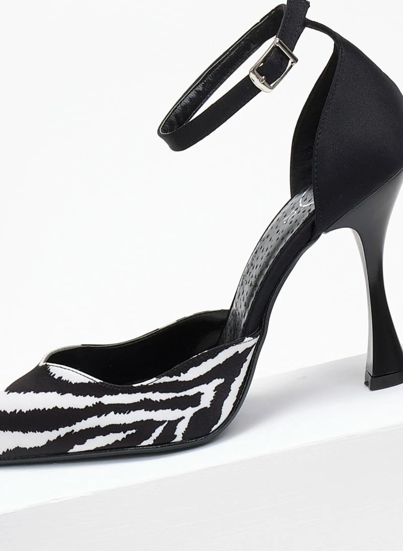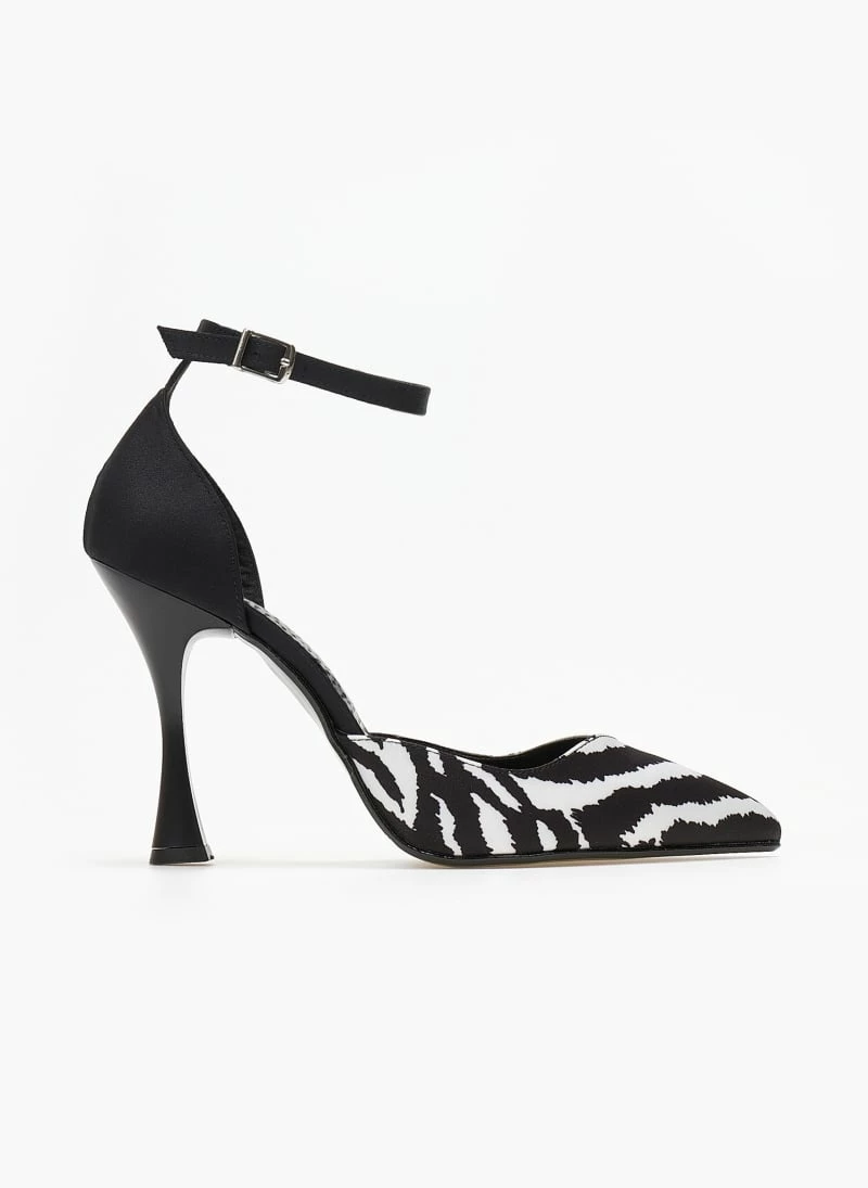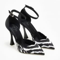 Γόβες ανοιχτές με print tfp. Έχoυν κλειστή φτέρνα. Δένουν με μπαρέτα στο ύψος του αστραγάλου. V cut σχέδιο στα δάκτυλα. Δερμάτινος πάτος. Ελληνικής κατασκευής.