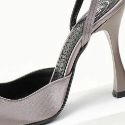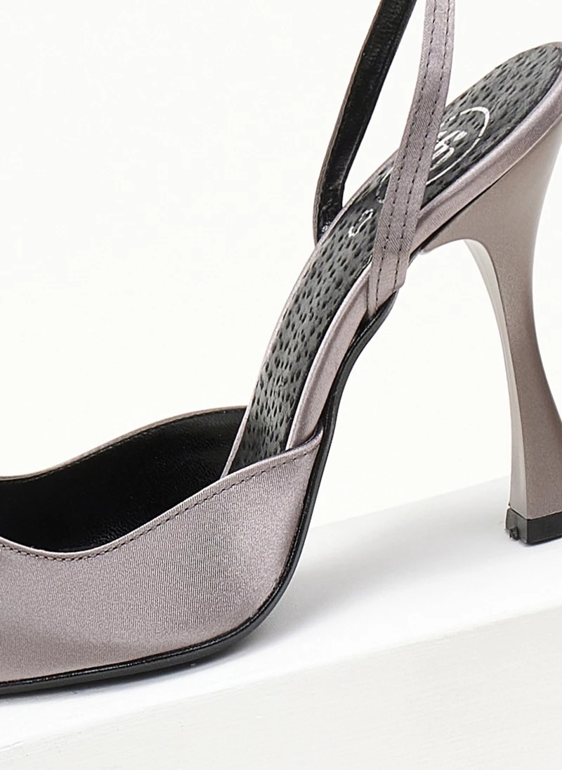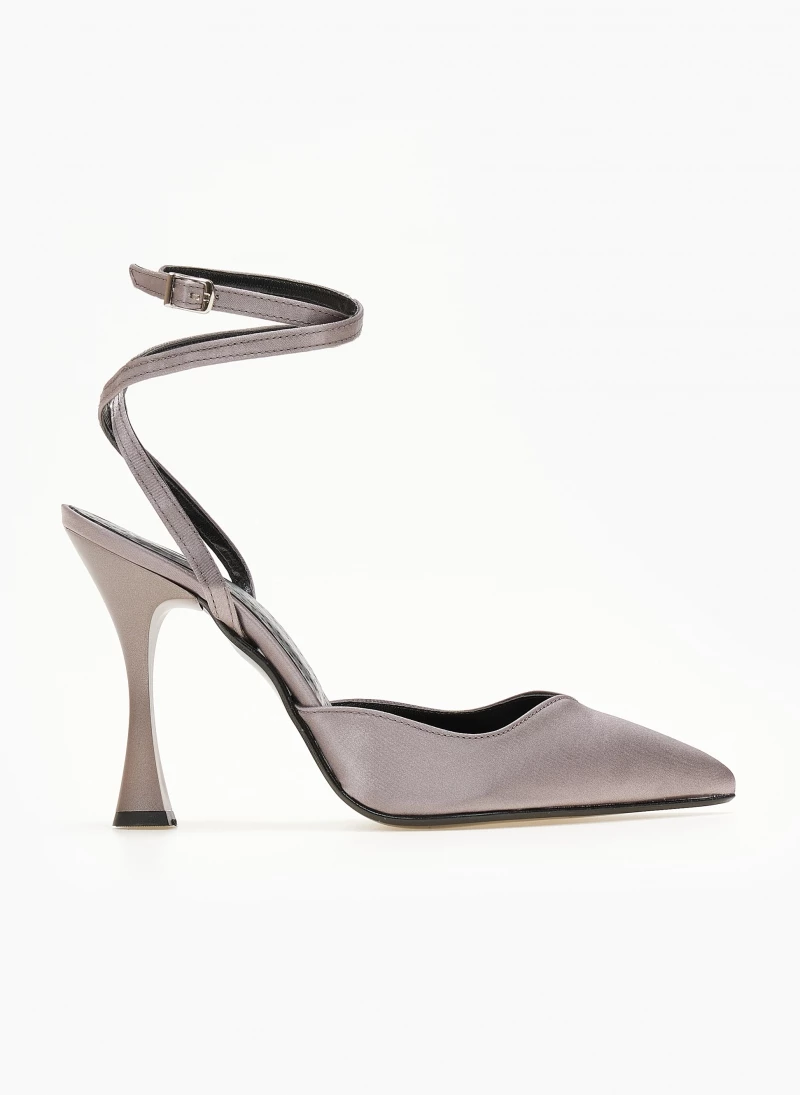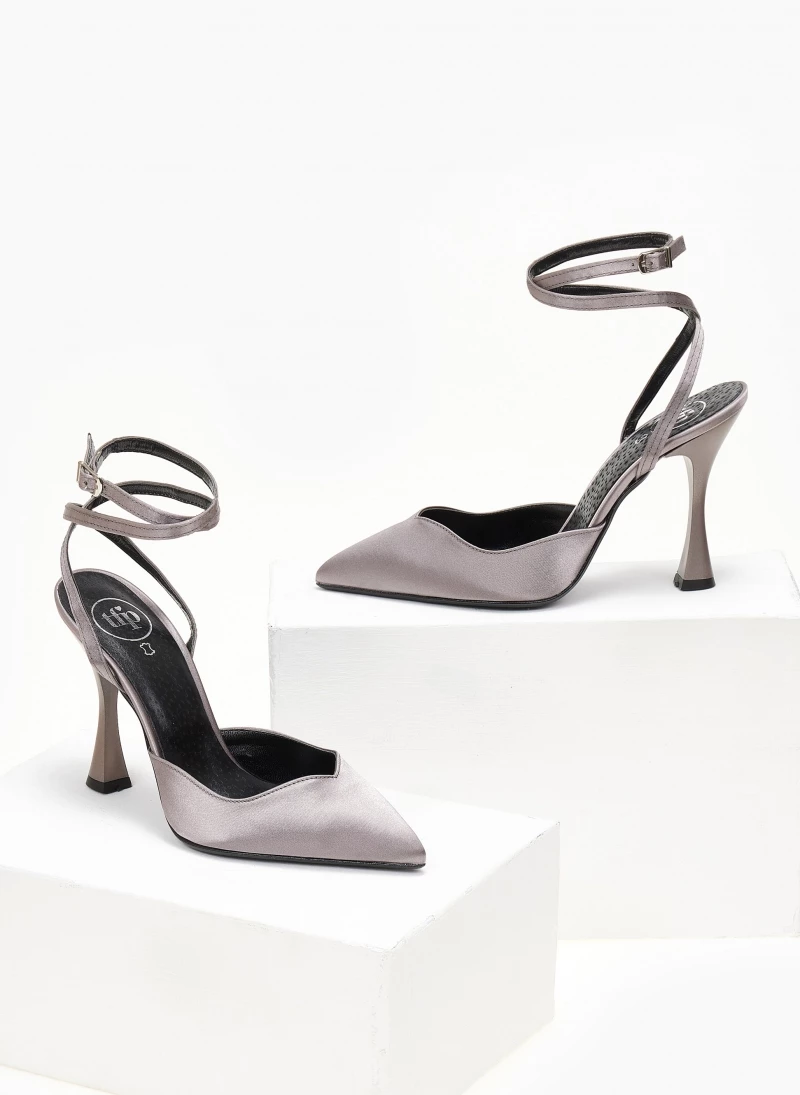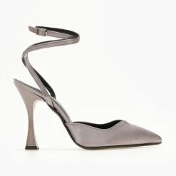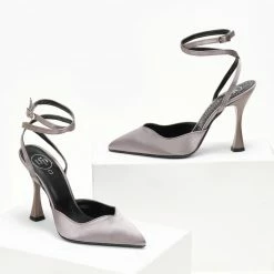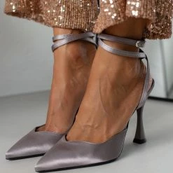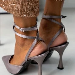 Γόβες σατέν μυτερές tfp. Δένουν με χιαστί λουράκι στο ύψος του ατσραγάλου. V cut σχέδιο στα δάκτυλα. Δερμάτινος πάτος. Ελληνικής κατασκευής.