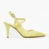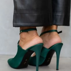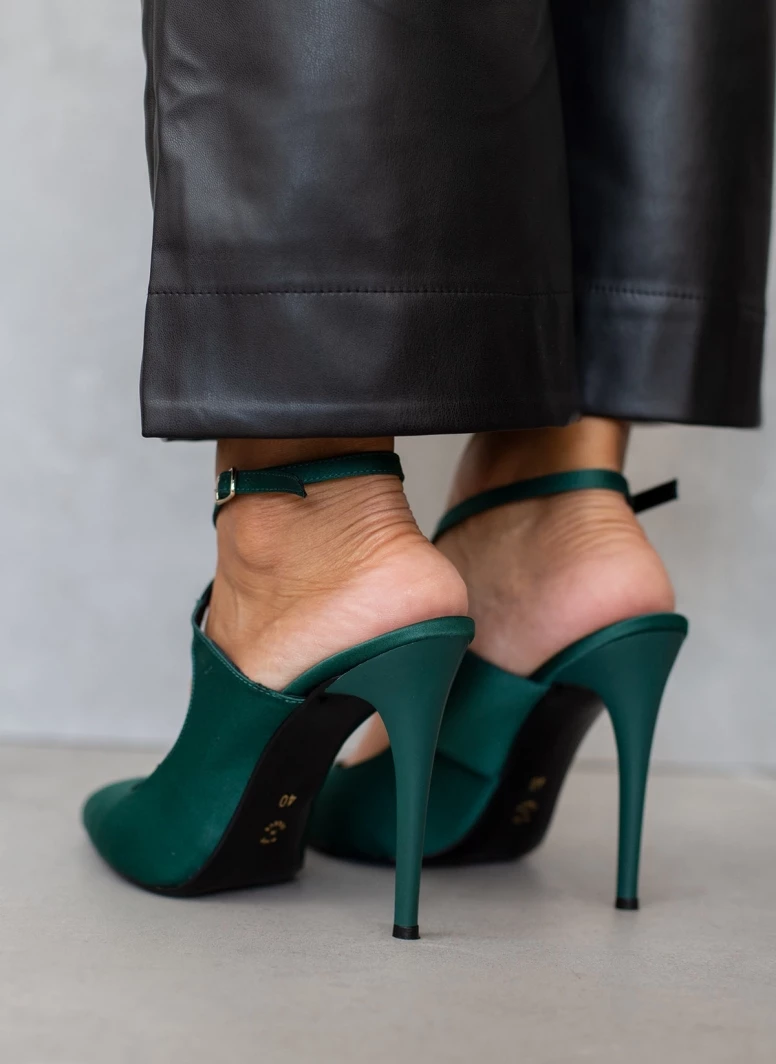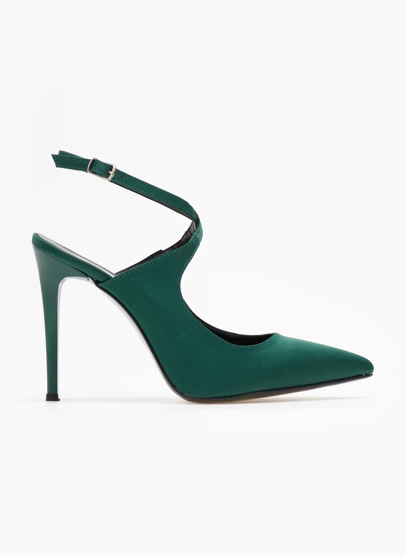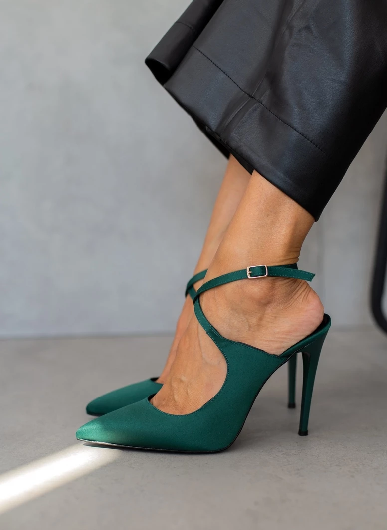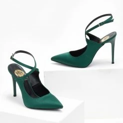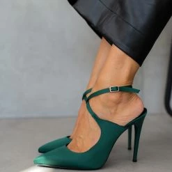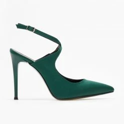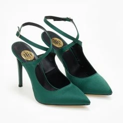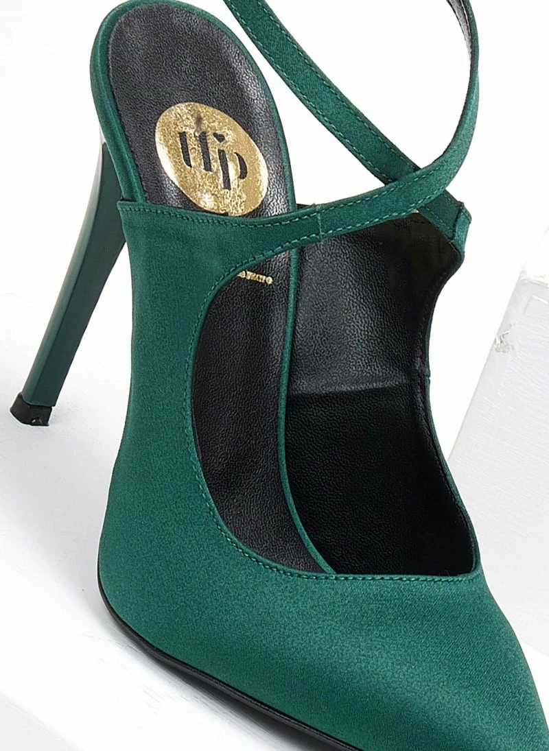 Γόβες ανοιχτές σατέν tfp. Δένουν με χιαστί λουράκι στο ύψος του κουτεπιέ. Ανοιχτή φτέρνα. Ελληνικής κατασκευής.