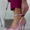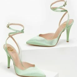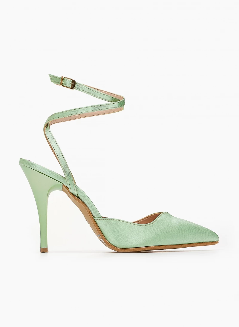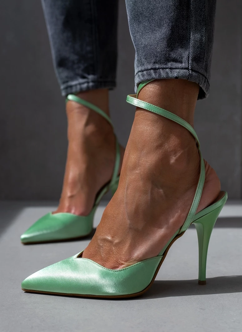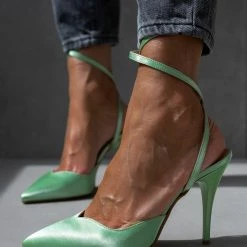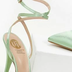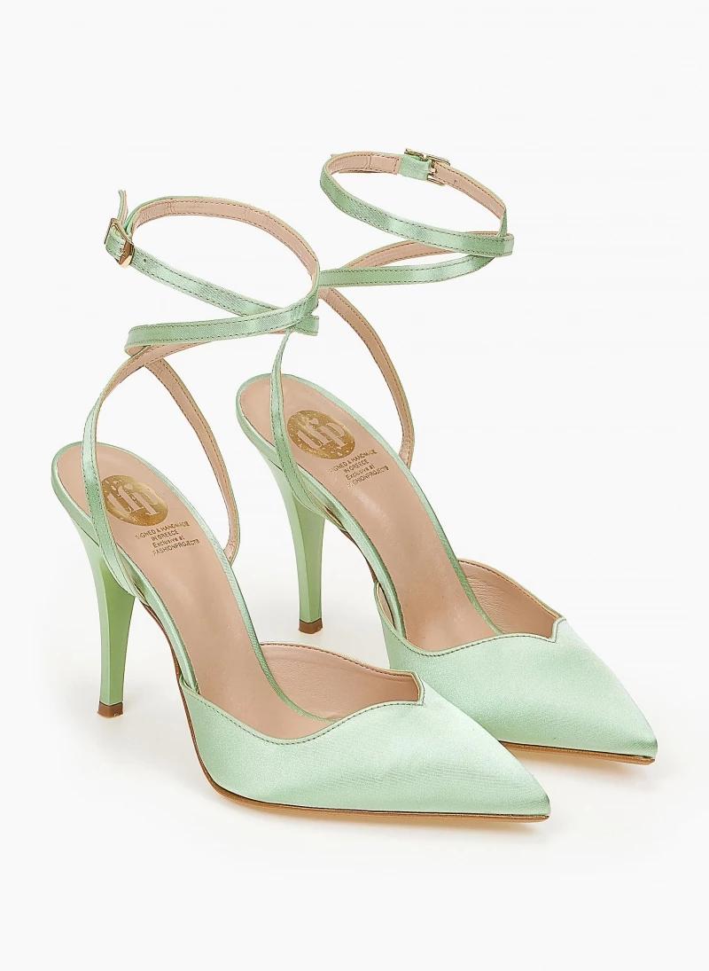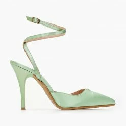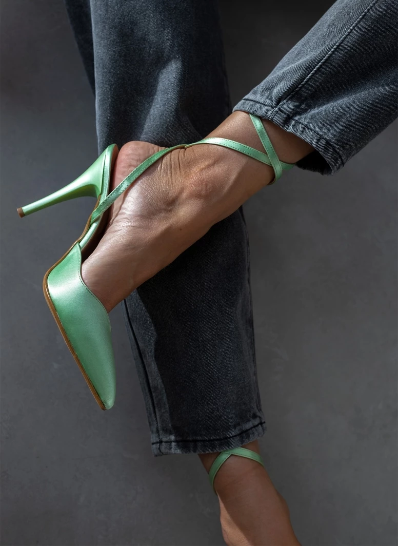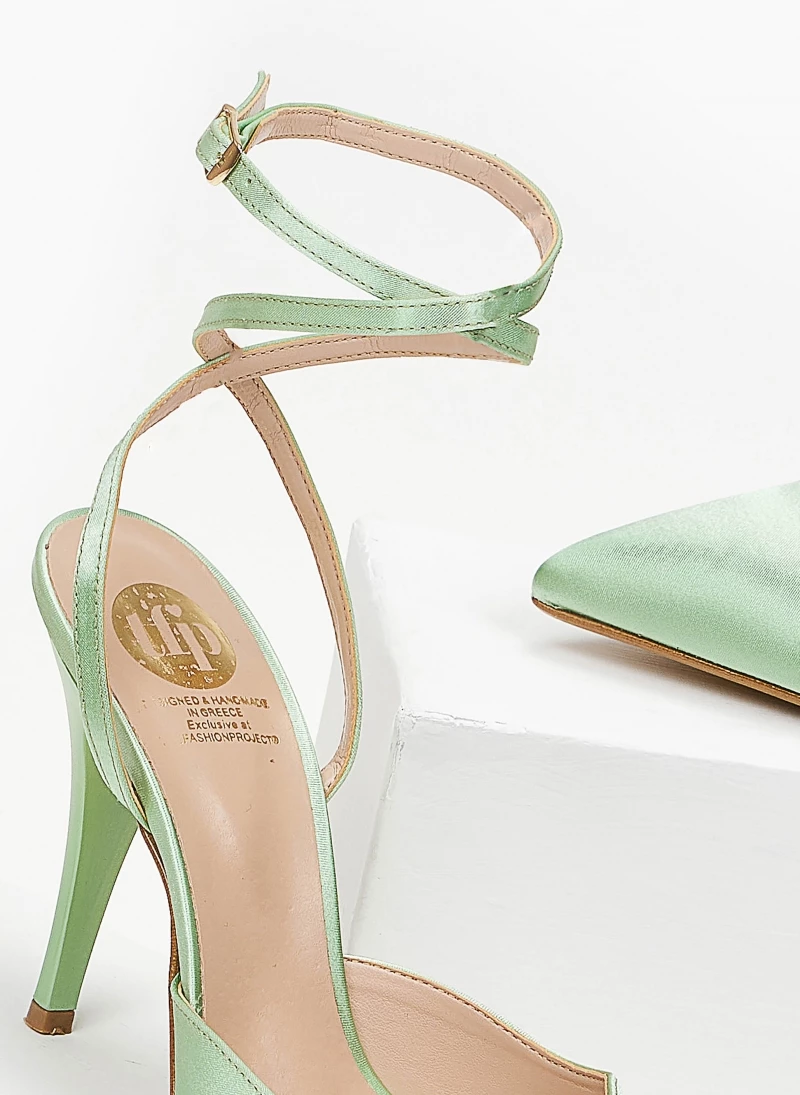Γόβες μυτερές με ψηλό λεπτό τακούνι. Δένουν στο ύψος του αστραγάλου με χιαστί λουράκι. Δερμάτινος πάτος. Ελληνικής κατασκευής.