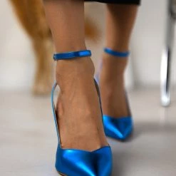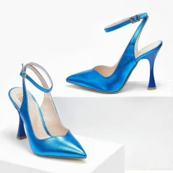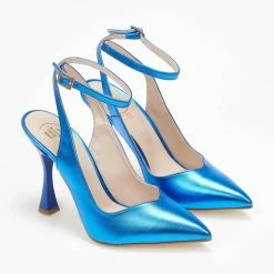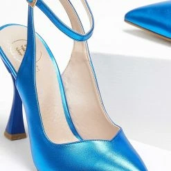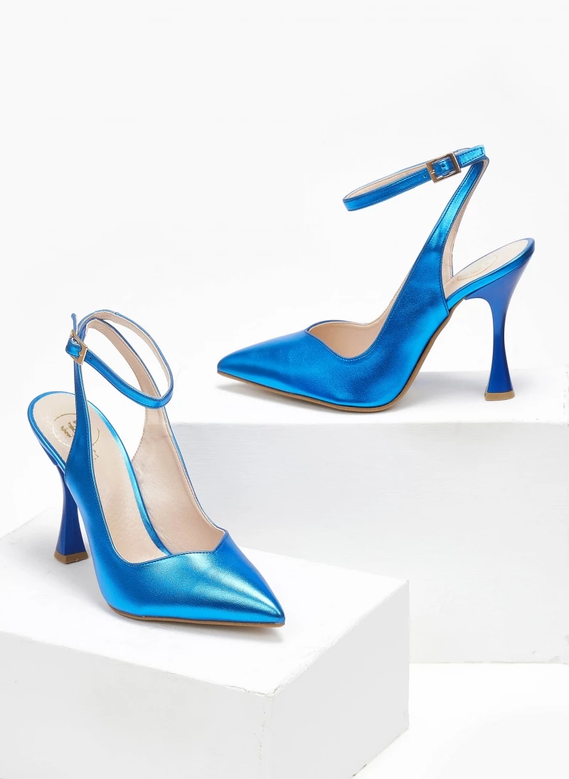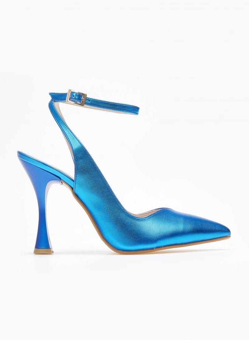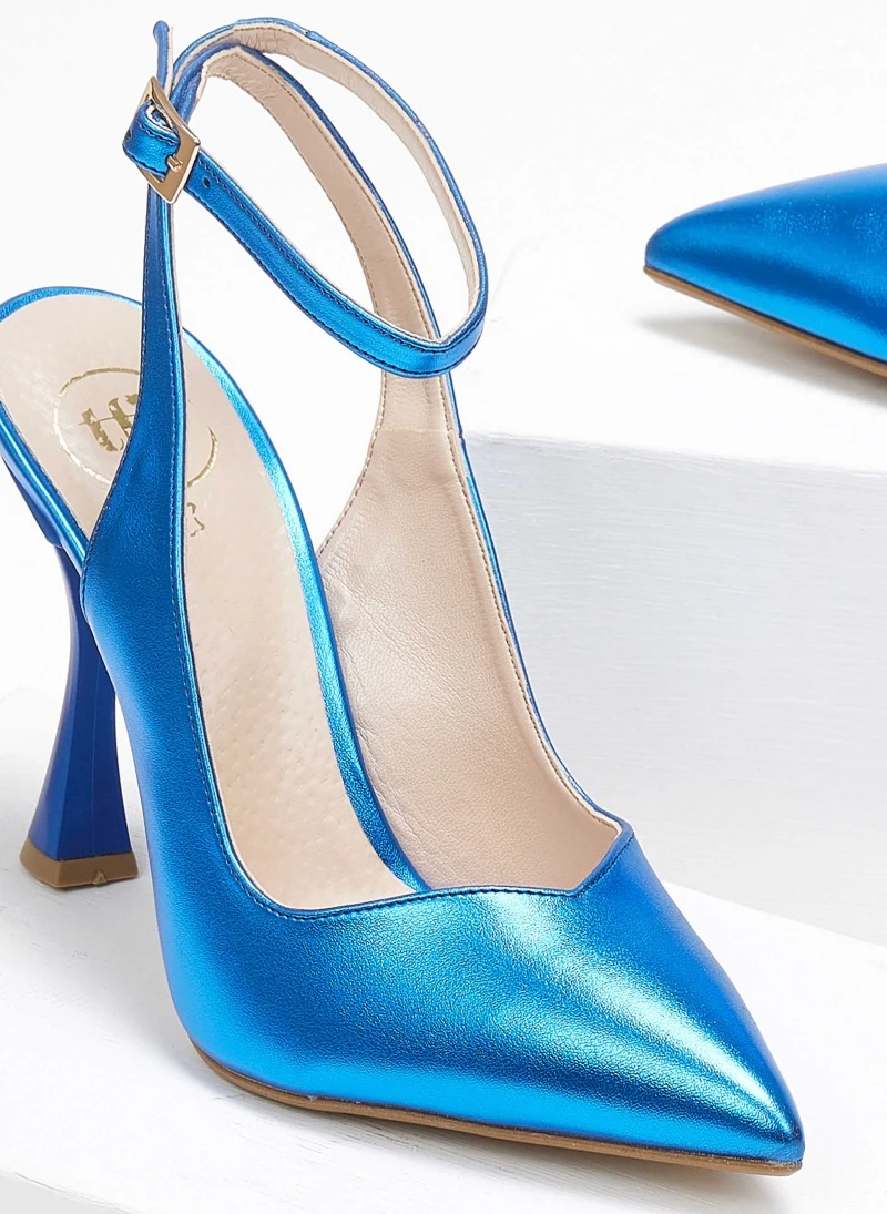 Tfp μυτερές γόβες με v cut άνοιγμα. Έχουν ανοιχτή φτέρνα. Δένουν με μπαρέτα στο ύψος του αστραγάλου. Μεταλλικές αποχρώσεις,δερμάτινος πάτος. Ελληνικής καατσκευής.