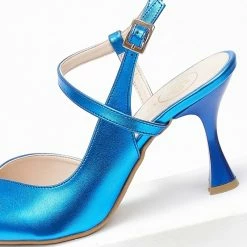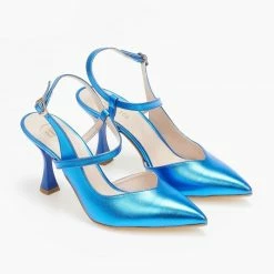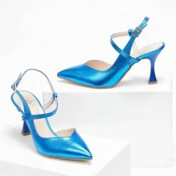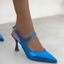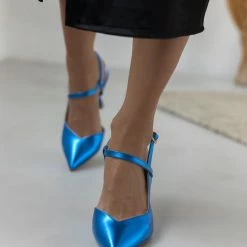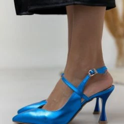 Γόβες μεταλλικές ανοιχτές tfp. Έχουν λοξό λουράκι στο κουτεπιέ. Δένουν στο πλάι. Δερμάτινος πάτος. Είναι μυτερές με V cut άνοιγμα. Ελληνικής κατασκευής.