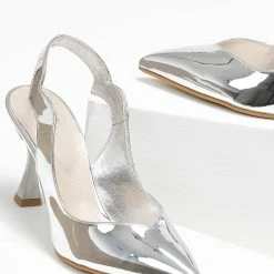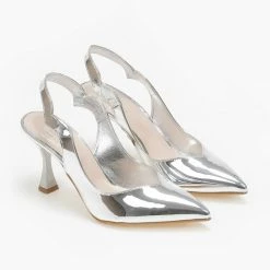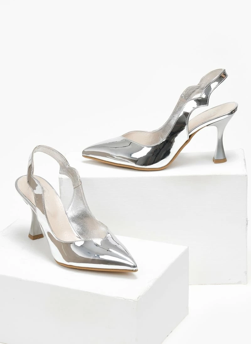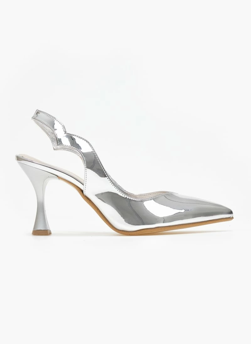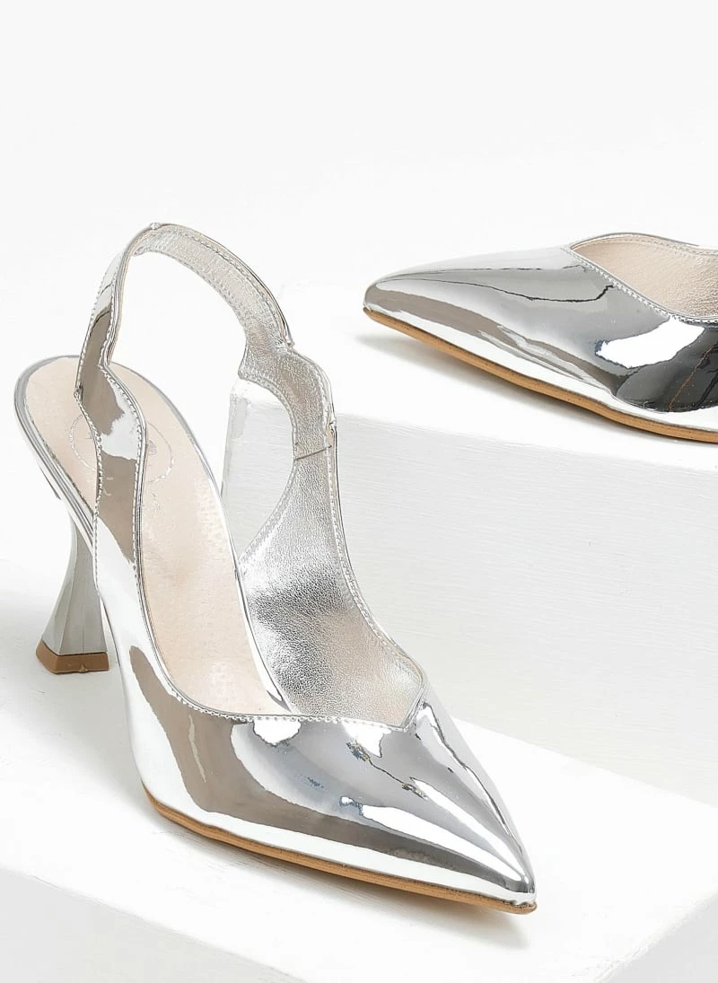 Γόβες μυτερές σε μεταλλικά χρώματα tfp. Είναι ανοιχτές με wavy λουράκι στο πίσω μέρος. V cut άνοιγμα στα δάκτυλα. Λεπτό τακούνι. Δερμάτινος πάτος. Ελληνικής κατασκευής.