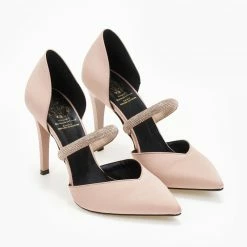 Γόβες μυτερές σατέν tfp με ανοιχτά πλαϊνά. Έχουν strass λουράκι στο ύψος του κουτεπιέ. Κλειστή φτέρνα. Σχέδιο v cut στα δάκτυλα. Ελληνικής κατασκευής.
