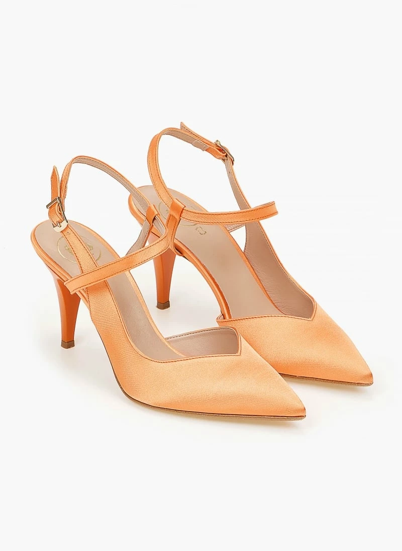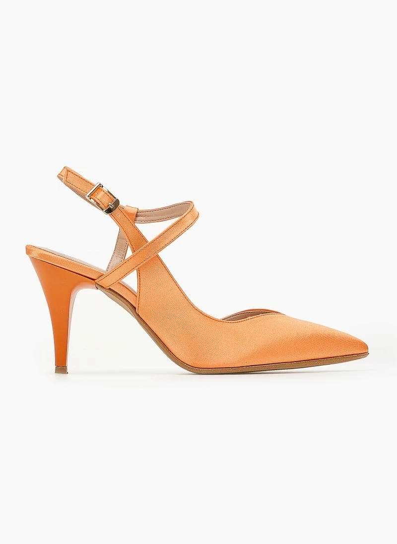 Tfp γόβες ανοιχτές σατέν με λεπτό τακούνι. Έχουν χιαστί λουράκι στο πλάι. Δερμάτινος πάτος. Ελληνικής κατασκευής.