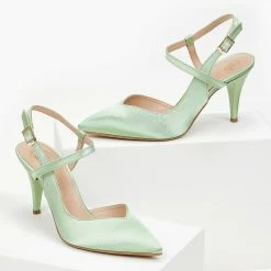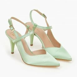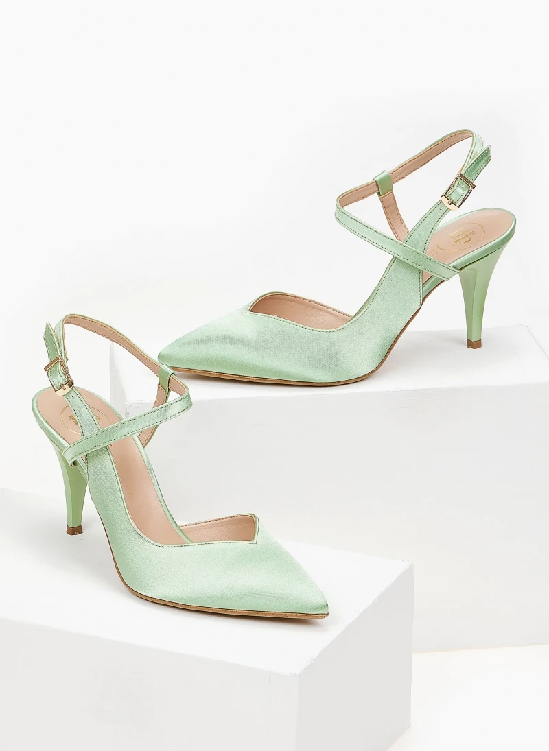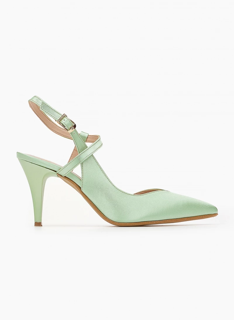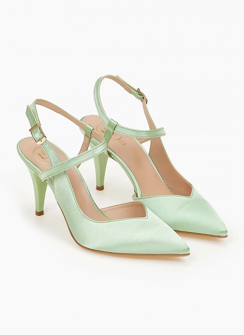 Tfp γόβες ανοιχτές σατέν με λεπτό τακούνι. Έχουν χιαστί λουράκι στο πλάι. Δερμάτινος πάτος. Ελληνικής κατασκευής.