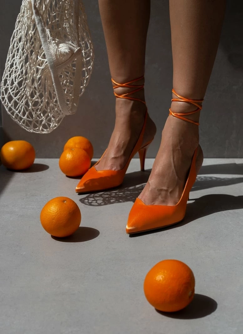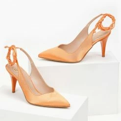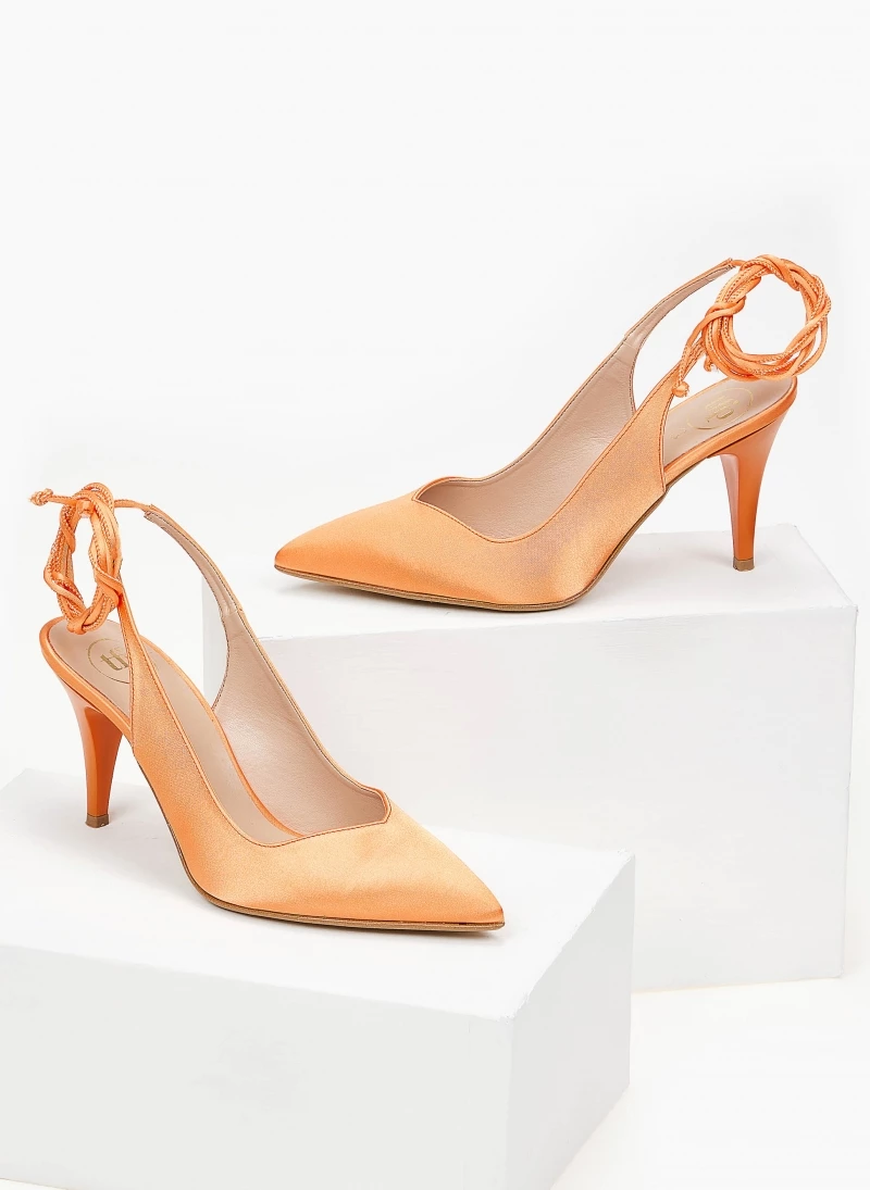 TFP σατέν γόβες με λεπτό τακούνι.Είναι ανοιχτές στο πίσω μέρος.Δένουν με κορδόνια στη γάμπα.Ελληνικής κατασκευής.