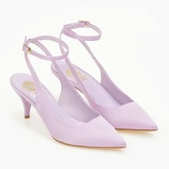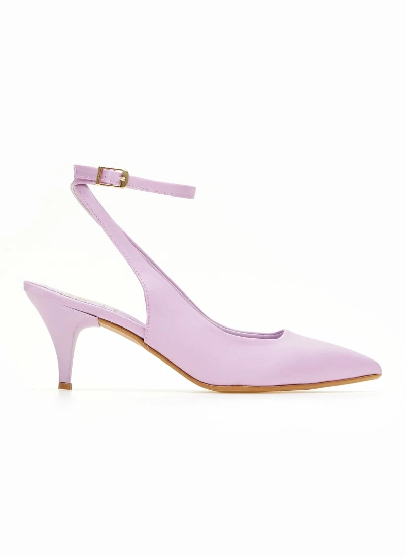 Γόβες σατέν TFP με χαμηλό λεπτό τακούνι.Είναι ανοιχτές στο πίσω μέρος.Δένουν με λουράκι στο ύψος του αστραγάλου.Δερμάτινος πάτος.Ελληνικής κατασκευής.