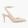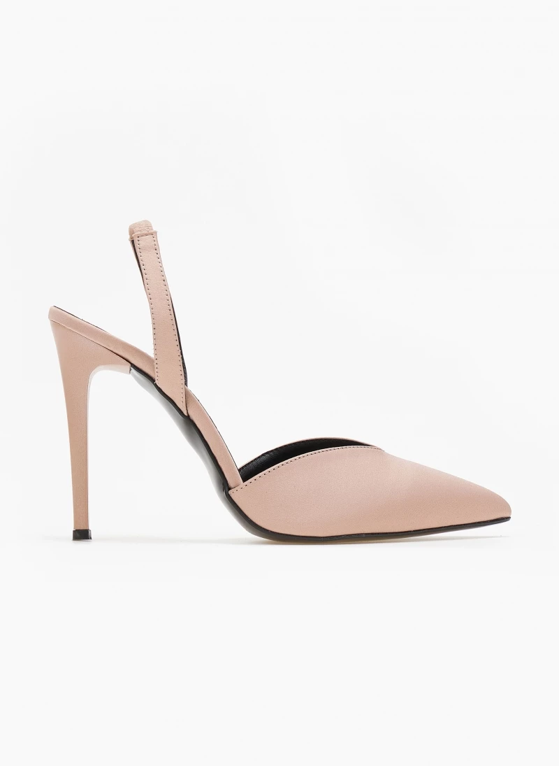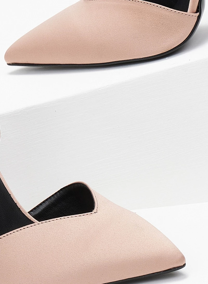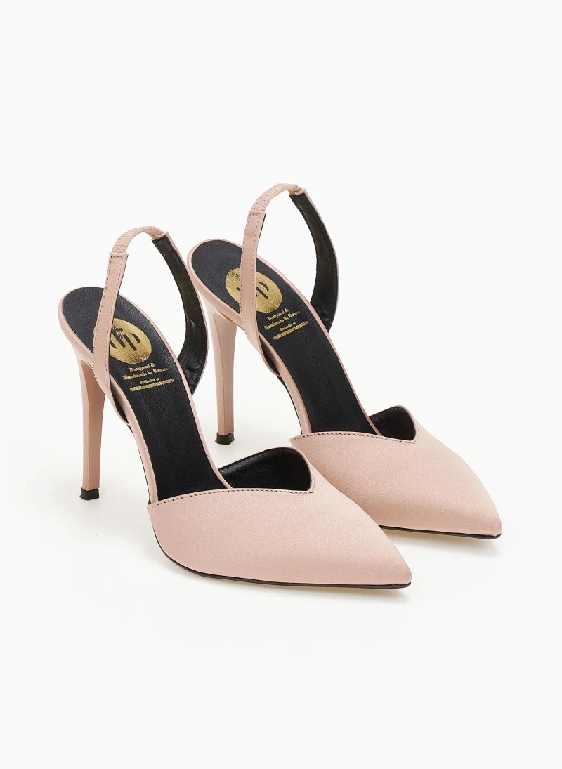 Γόβες σατέν μυτερέςtfp . Έχουν ανοιχτή φτέρνα με λουράκι. V cut σχέδιο στα δάκτυλα. Ελληνικής κατασκευής.