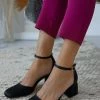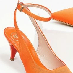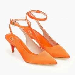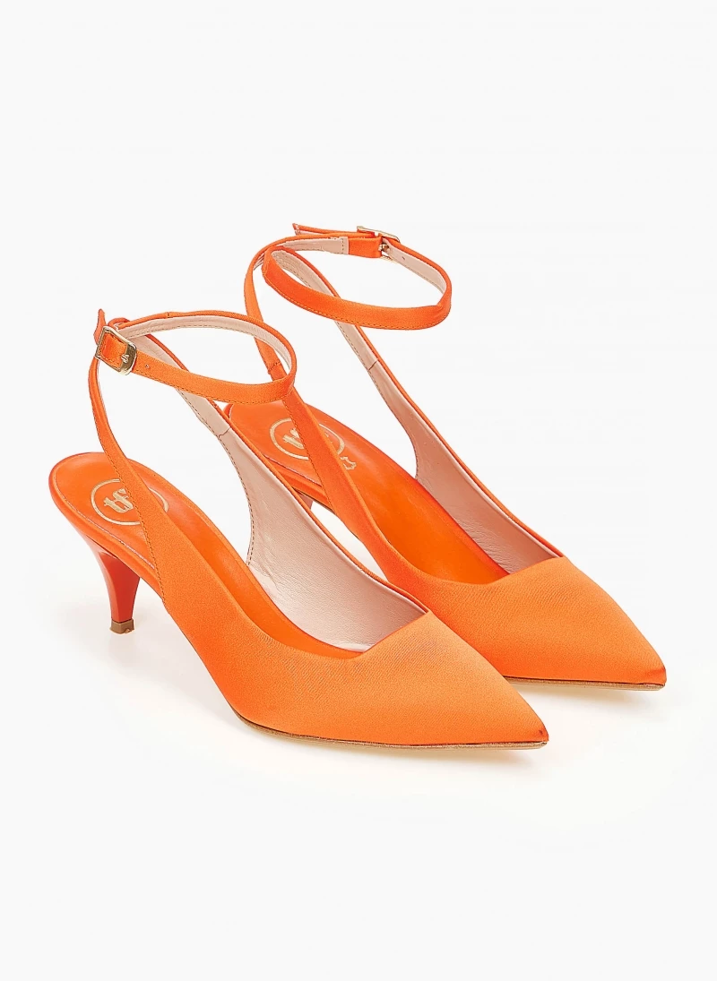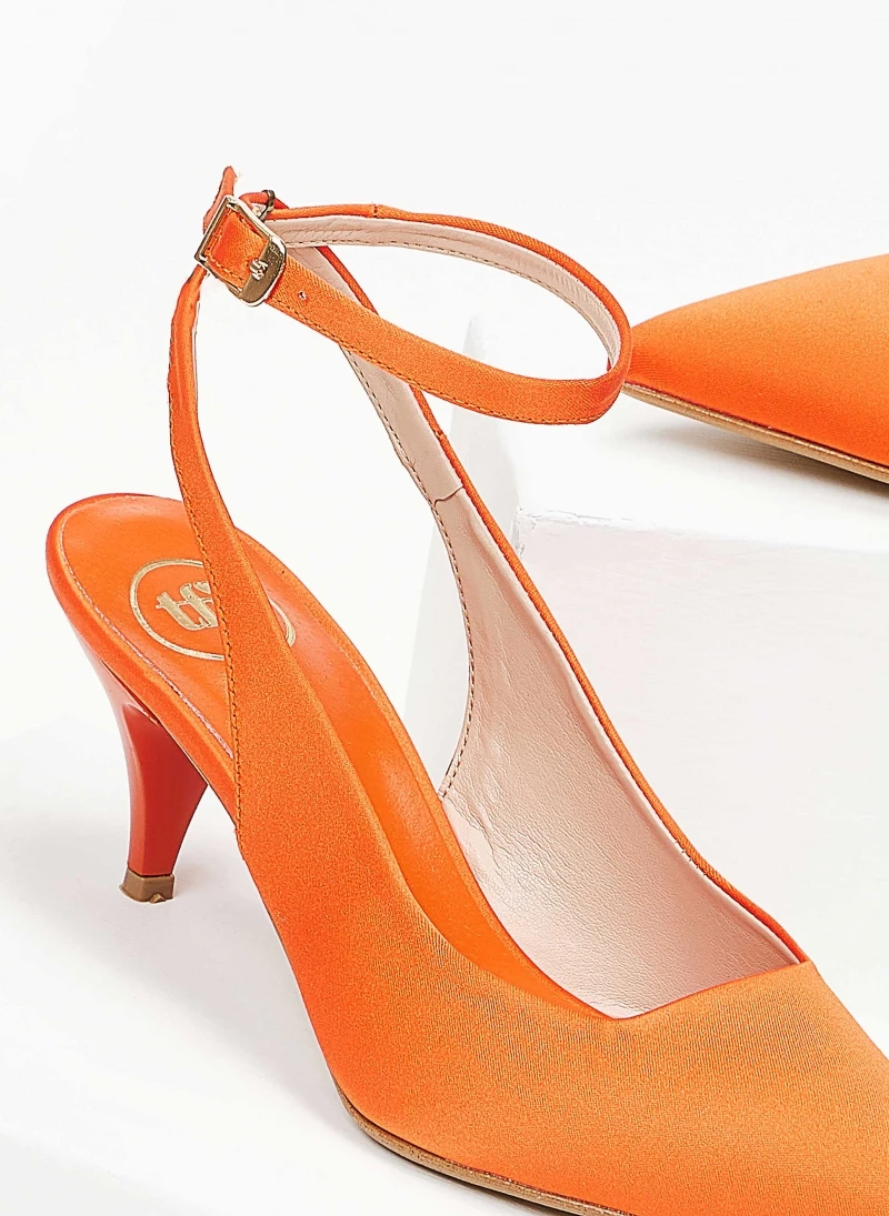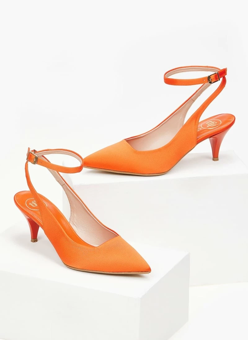Γόβες σατέν TFP με χαμηλό λεπτό τακούνι.Είναι ανοιχτές στο πίσω μέρος.Δένουν με λουράκι στο ύψος του αστραγάλου.Δερμάτινος πάτος.Ελληνικής κατασκευής.