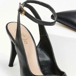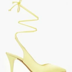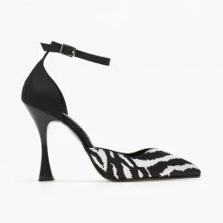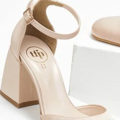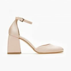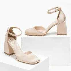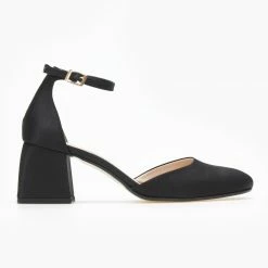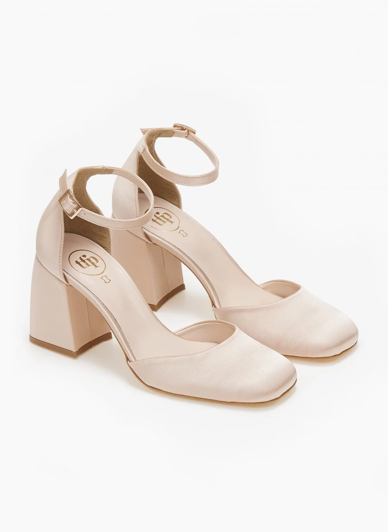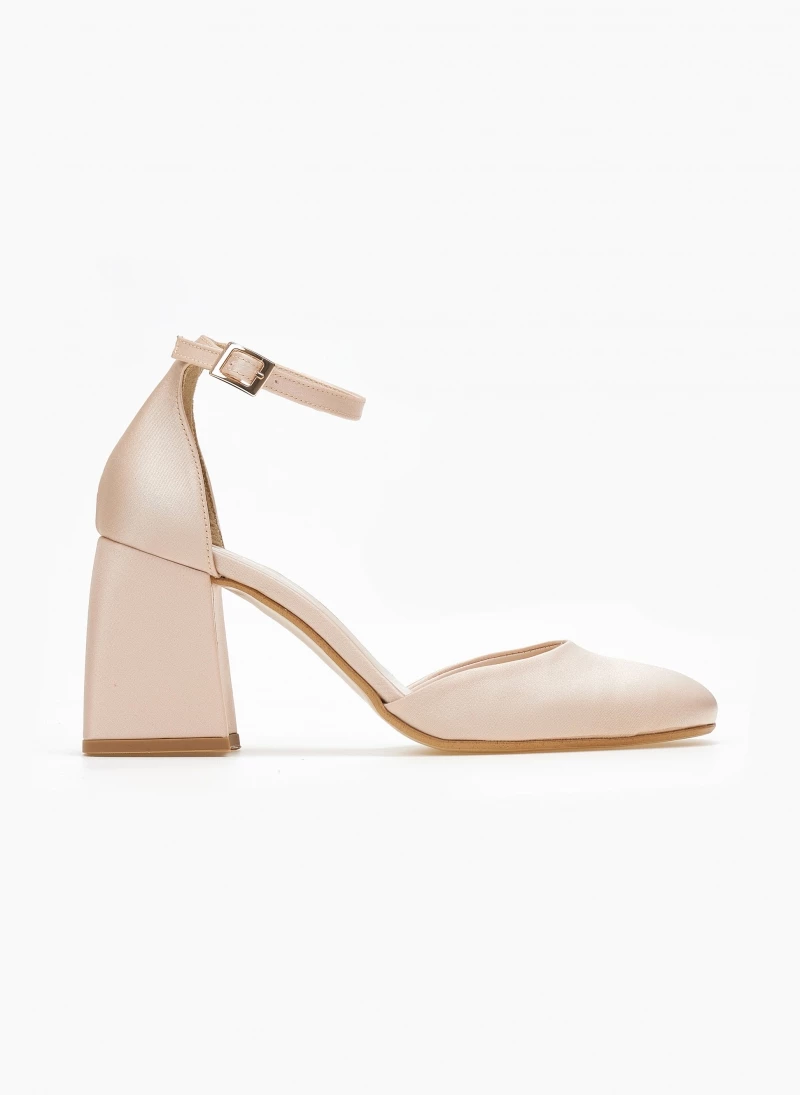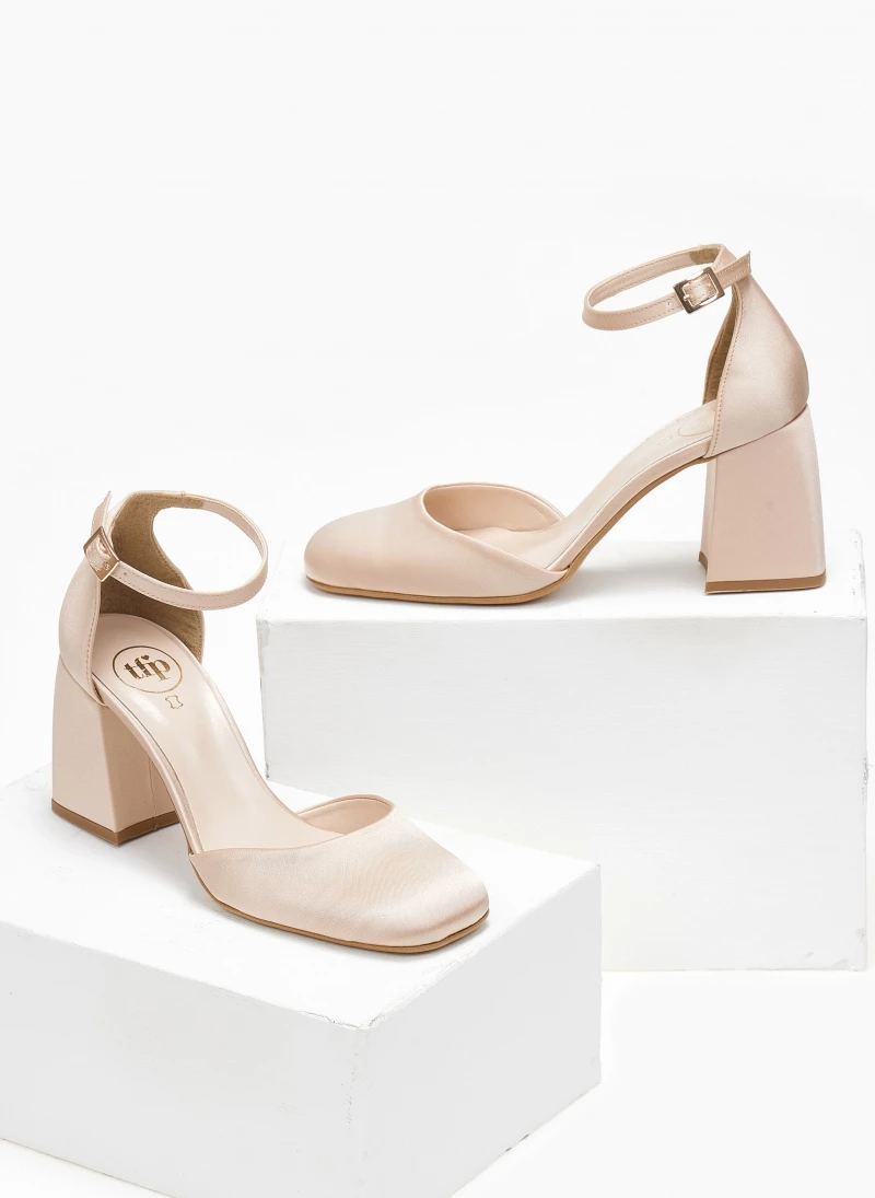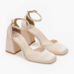 Γόβες σατέν tfp σε καρέ γραμμή. Έχουν ανοιχτά πλαϊνά. Κλειστή φτέρνα. Δένουν με μπαρέτα στο ύψος του αστραγάλου. Δερμάτινος πάτος. Ελληνικής κατασκευής.