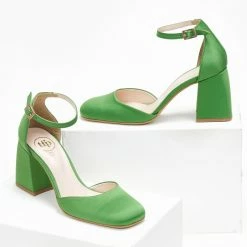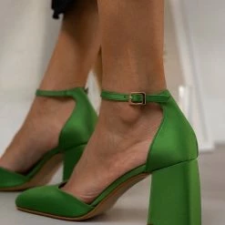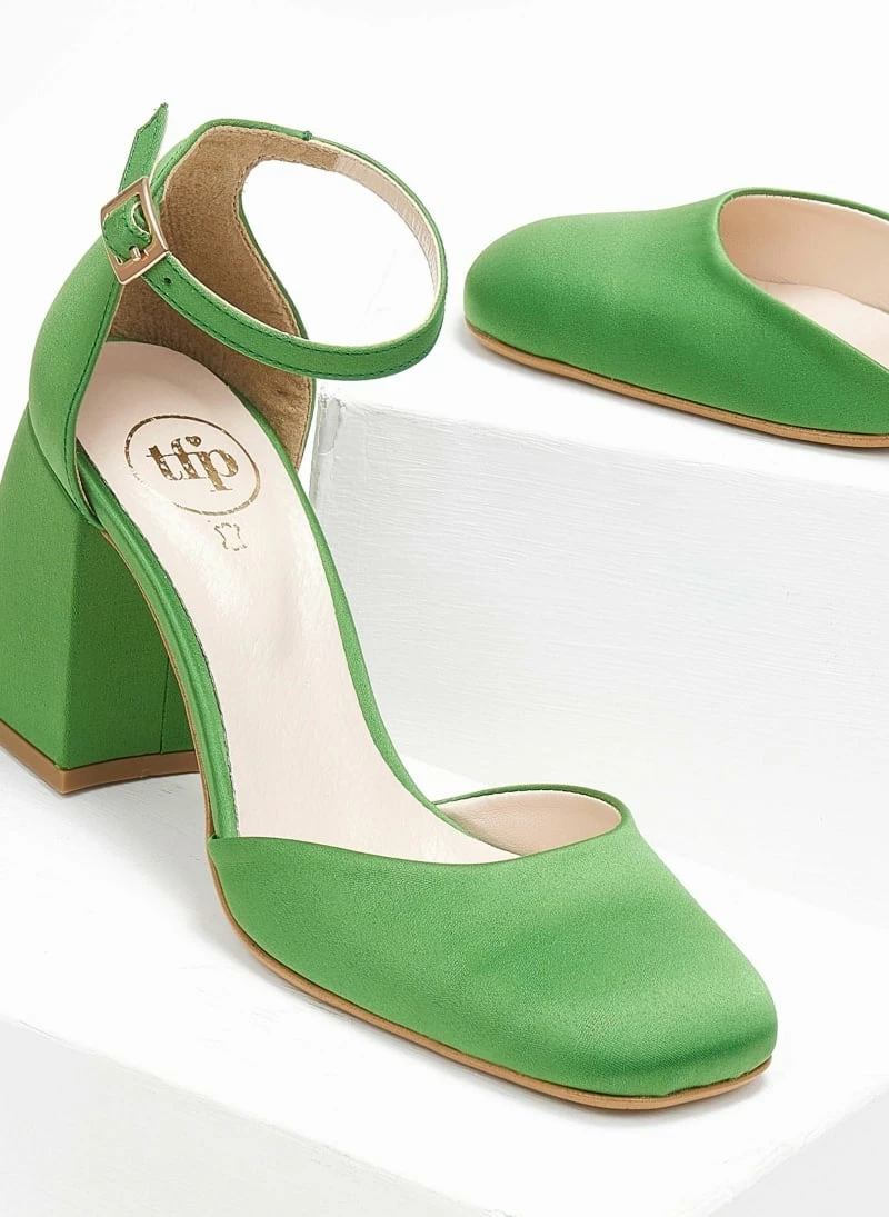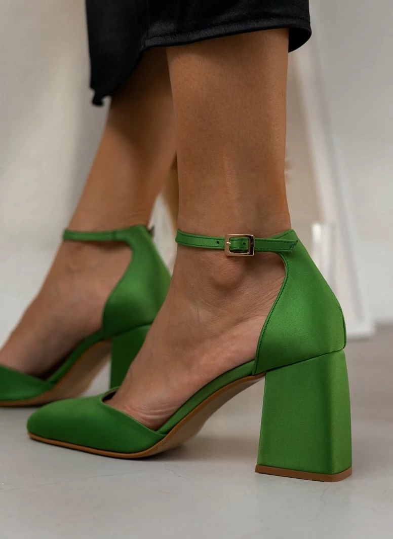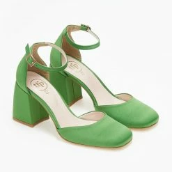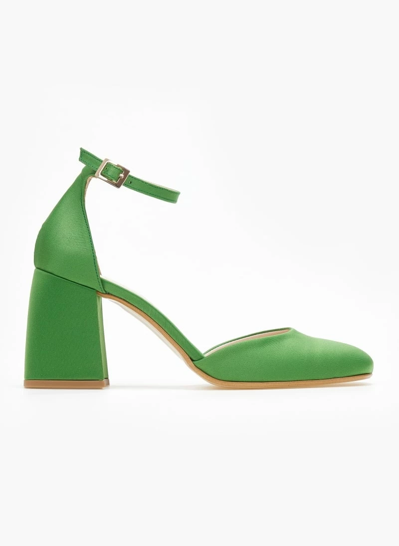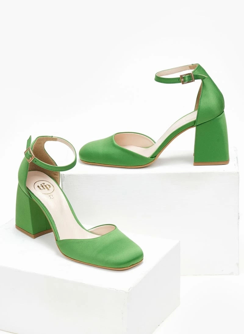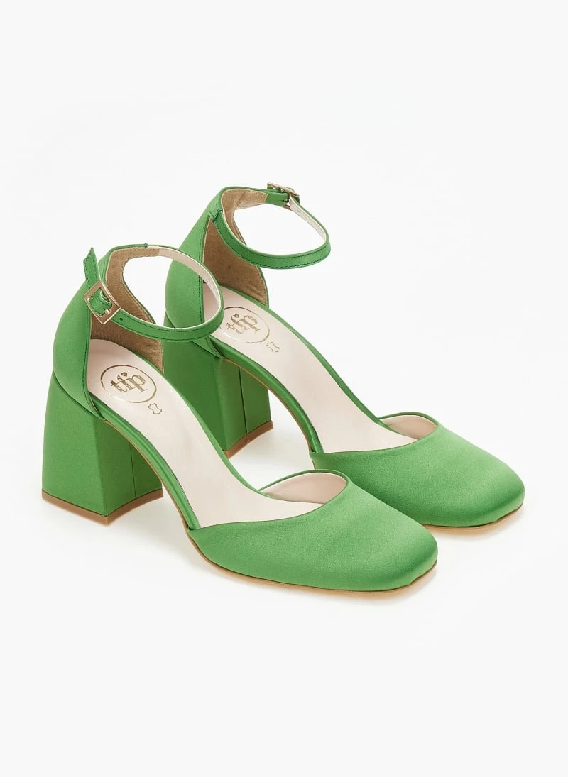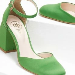 Γόβες σατέν tfp σε καρέ γραμμή. Έχουν ανοιχτά πλαϊνά. Κλειστή φτέρνα. Δένουν με μπαρέτα στο ύψος του αστραγάλου. Δερμάτινος πάτος. Ελληνικής κατασκευής.