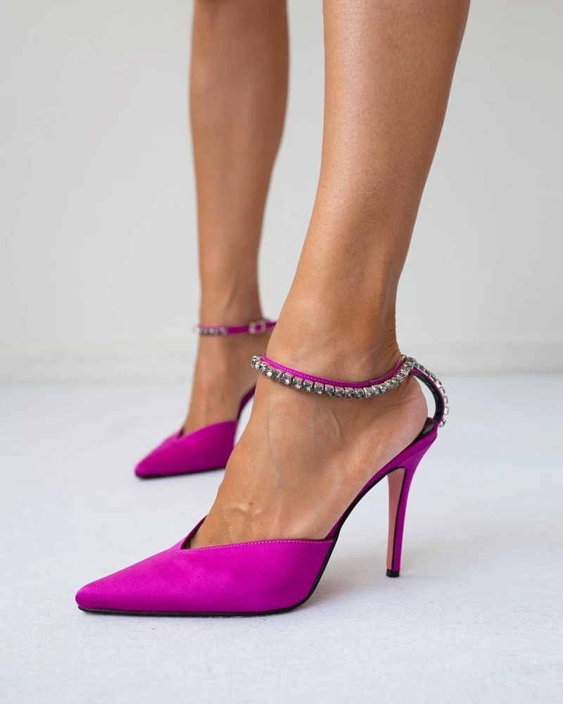 Tfp σατέν μυτερές γόβες με strass. Έχουν v cut άνοιγμα. Με ανοιχτή μπαρέτα με μεγάλα διακοσμητικά strass που δένει στο ύψος του αστραγάλου. Δερμάτινος πάτος .Ελληνικής κατασκευής.