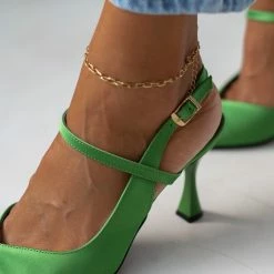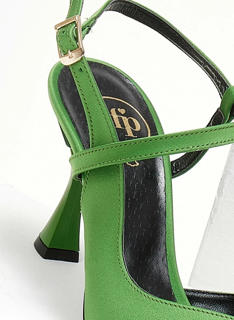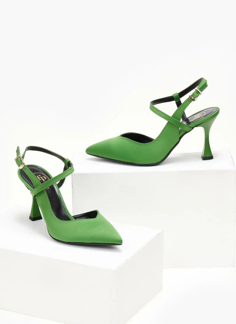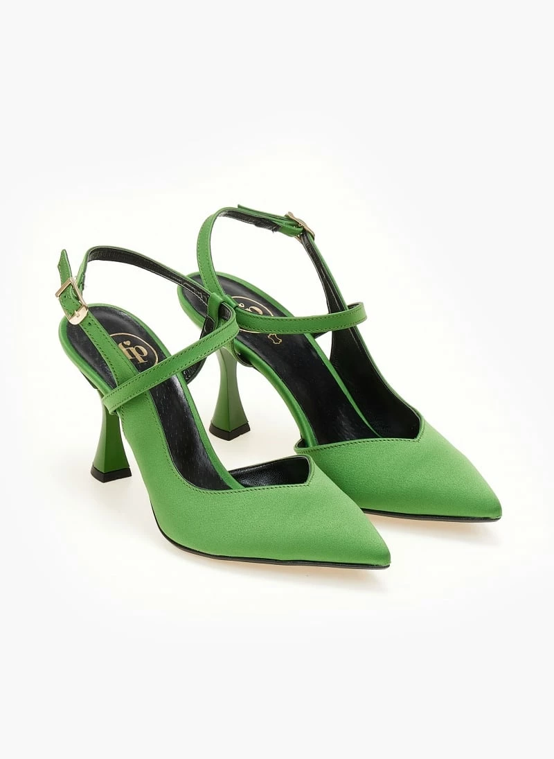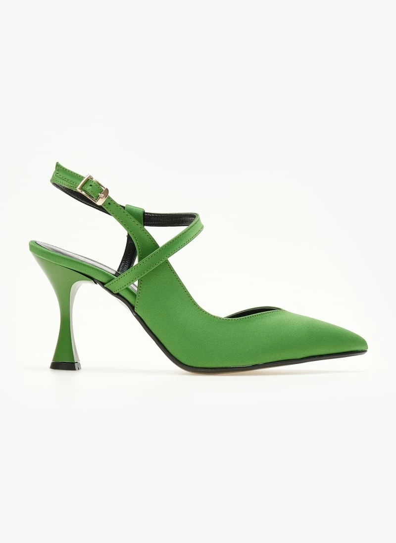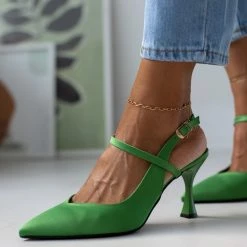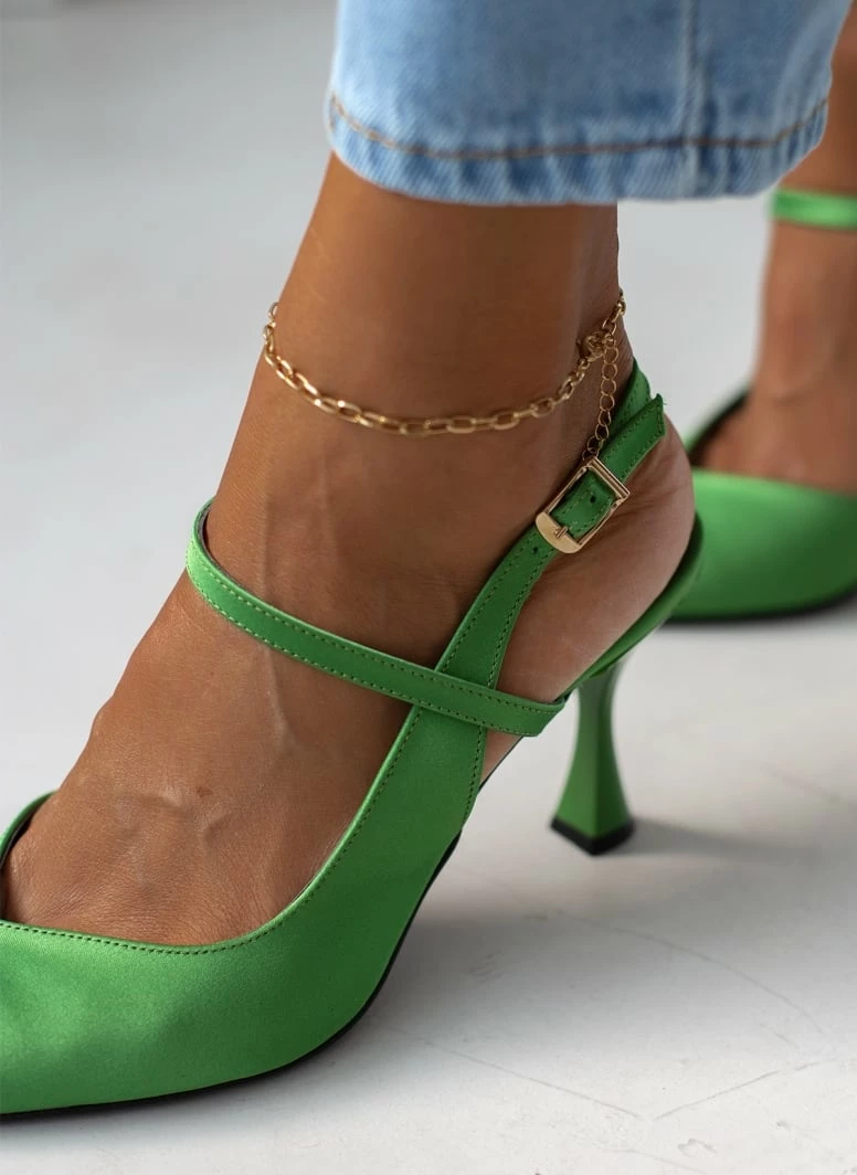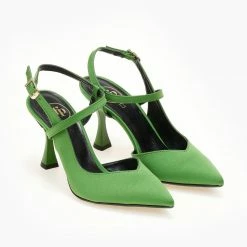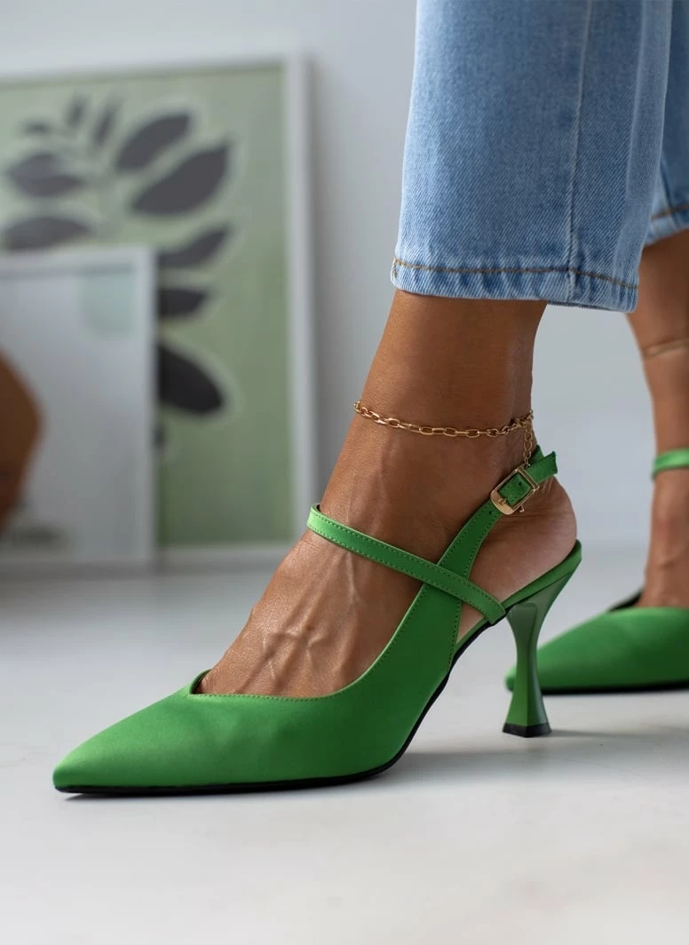 Γόβες σατέν tfp με χαμηλό τακούνι. Έχουν μυτερή φόρμα με v cut σχέδιο στα δάκτυλα. Λοξό λουράκι στο κουτεπιέ. Δένουν στο πλάι. Δερμάτινος πάτος. Ελληνικής κατασκευής.