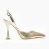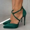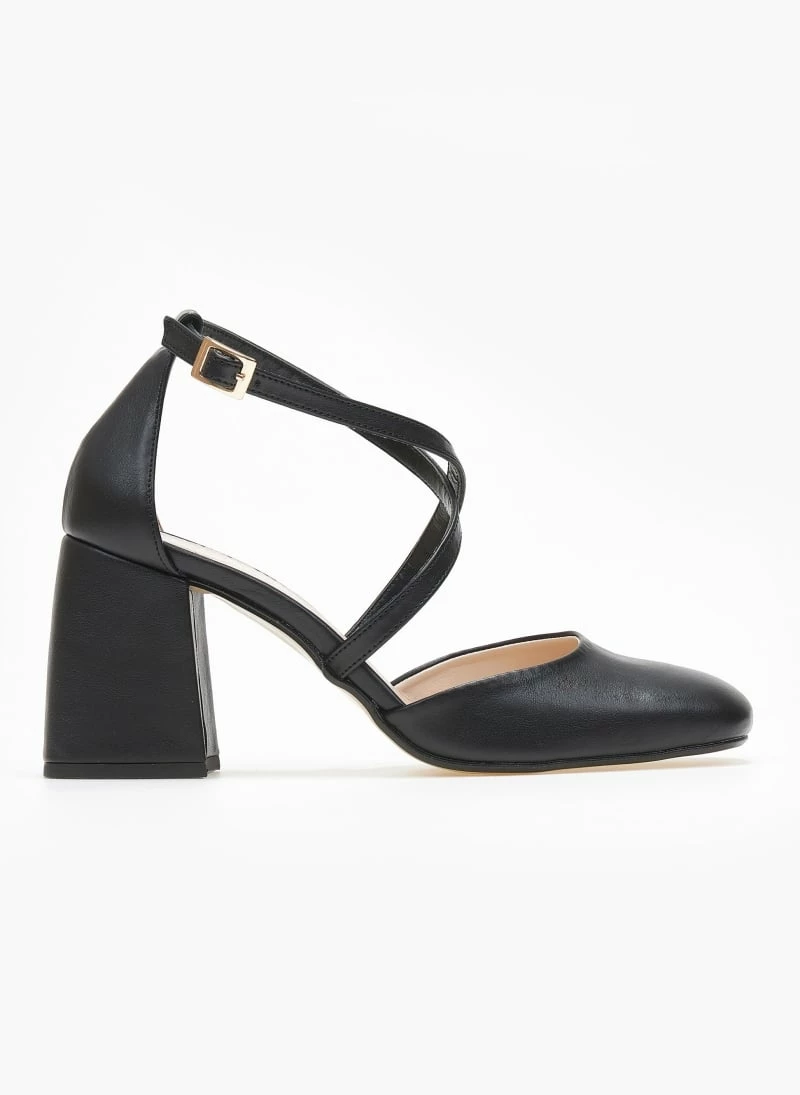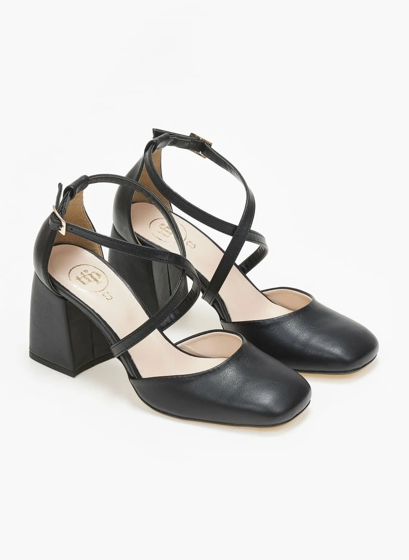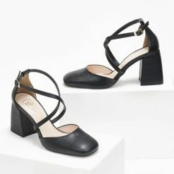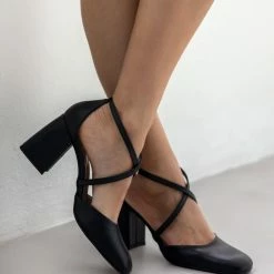 Γόβες με ανοίγματα στο πλάι. Έχουν χοντρό τακούνι. Δένουν με χιαστί λουράκια στο κουτεπιέ. Καρέ γραμμή. Δερμάτινος πάτος. Ελληνικής κατασκευής.