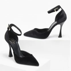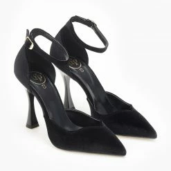 Γόβες velvet μυτερές tfp. Έχουν v cut σχέδιο στα δάκτυλα. Ανοιχτά πλαϊνά. Κλειστή φτέρνα. Δένουν με μπαρέτα στο ύψος του αστραγάλου. Δερμάτινος πάτος. Ελληνικής κατασκευής.