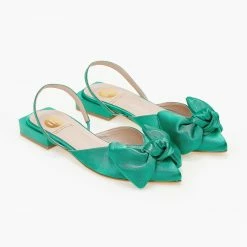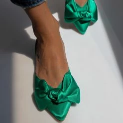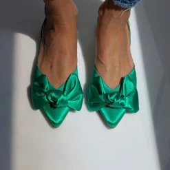 Mules tfp σατέν με μεγάλο φιόγκο. Έχουν λουράκι με διακριτικό λάστιχο στο πλάι. Μυτερή φόρμα. Φλατ τετράγωνο τακούνι. Το εσωτερικό του και ο πάτος είναι γνήσιο δέρμα. Ελληνικής κατασκευής..