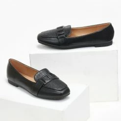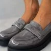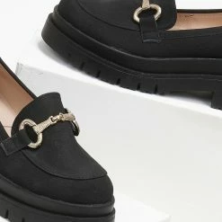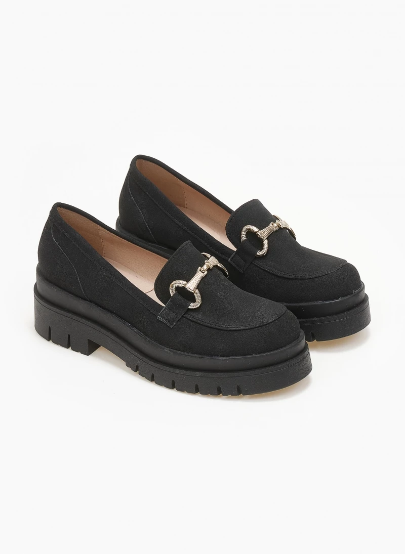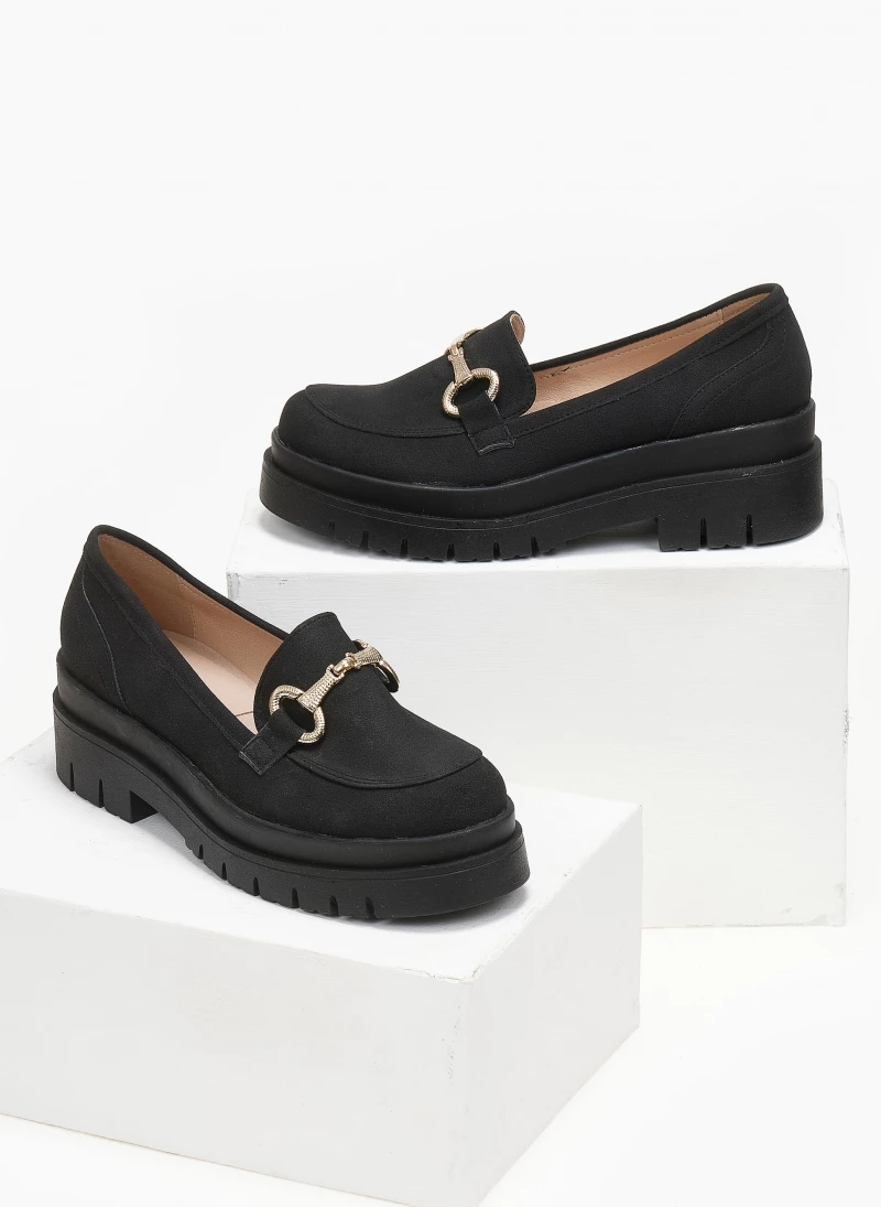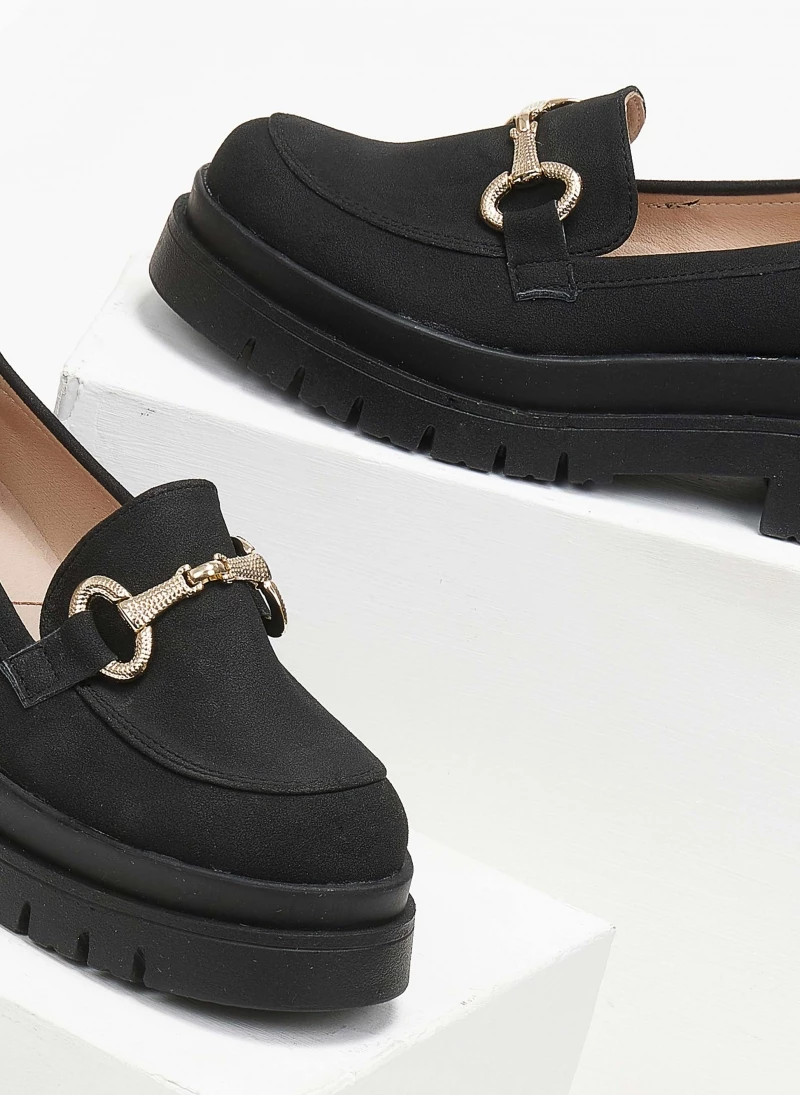 Loafers estil με χρυσό μεταλλικό διακοσμητικό. Έχουν δίπατη τρακτερωτή σόλα. Ελληνικής κατασκευής.