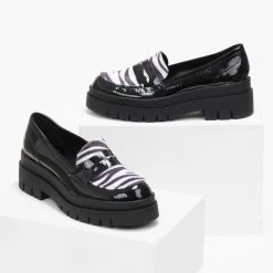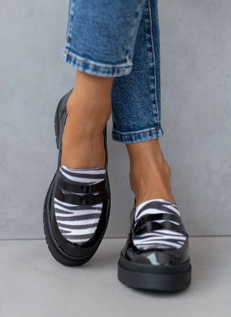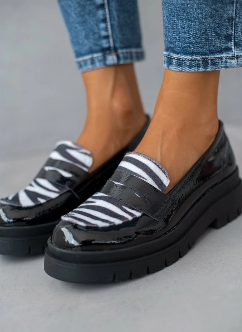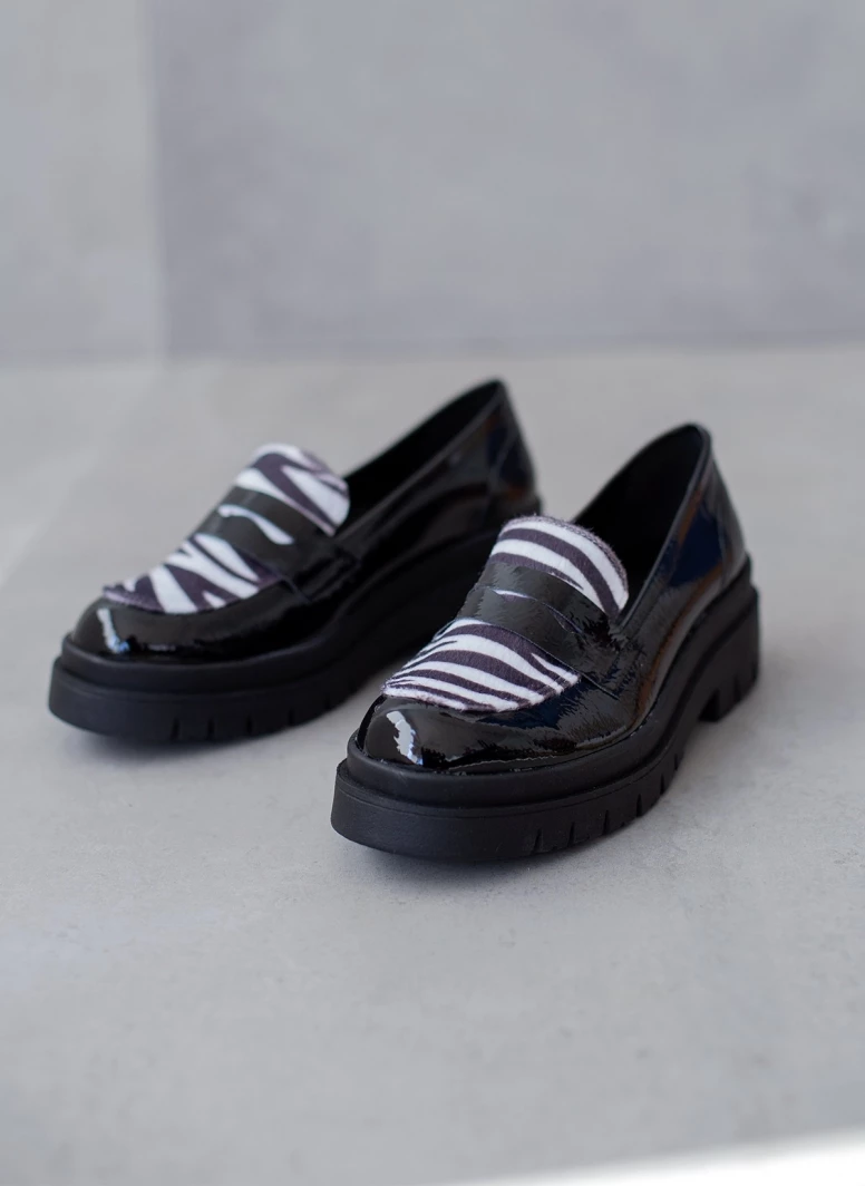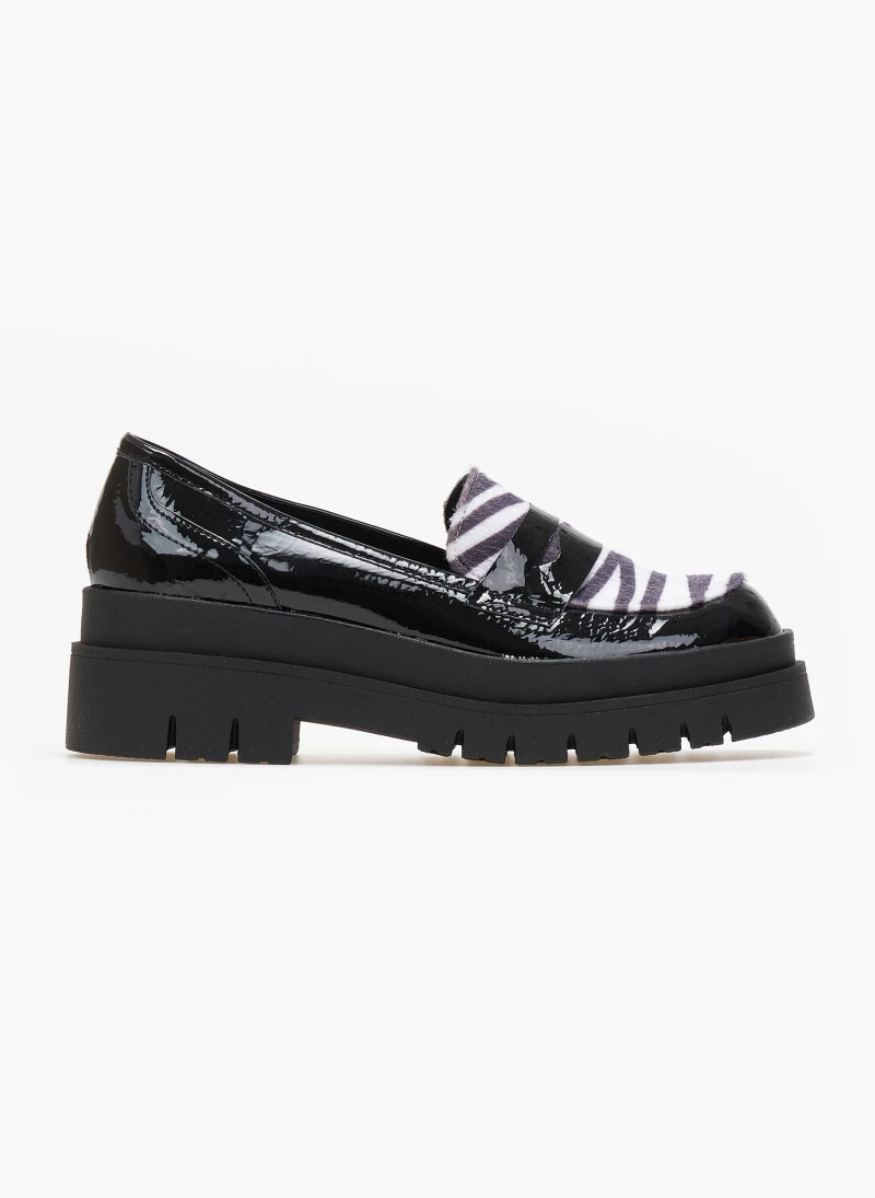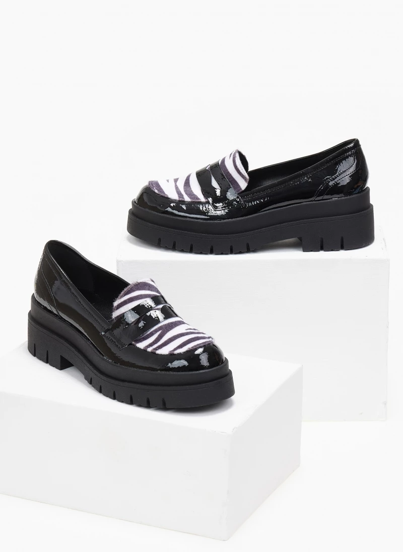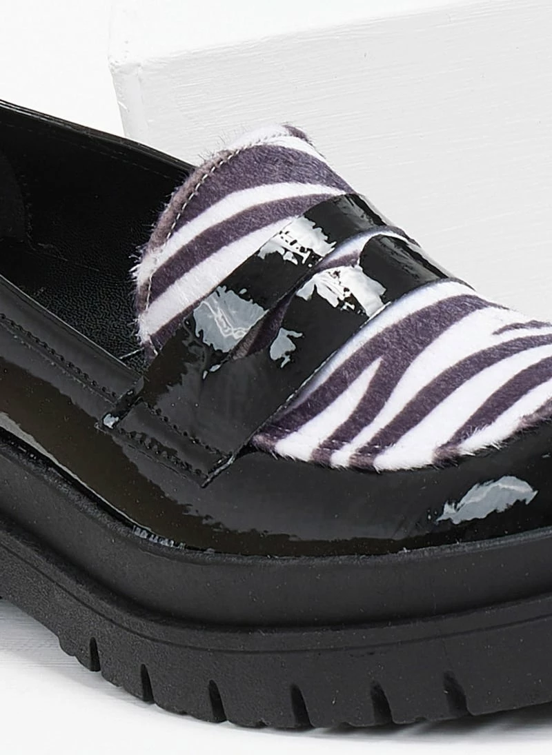 Loafers λουστρίνι estil με ψηλή σόλα. Έχουν animal print λεπτομέρεια από συνθετικό ponyskin. Ελληνικής κατασκευής.