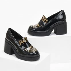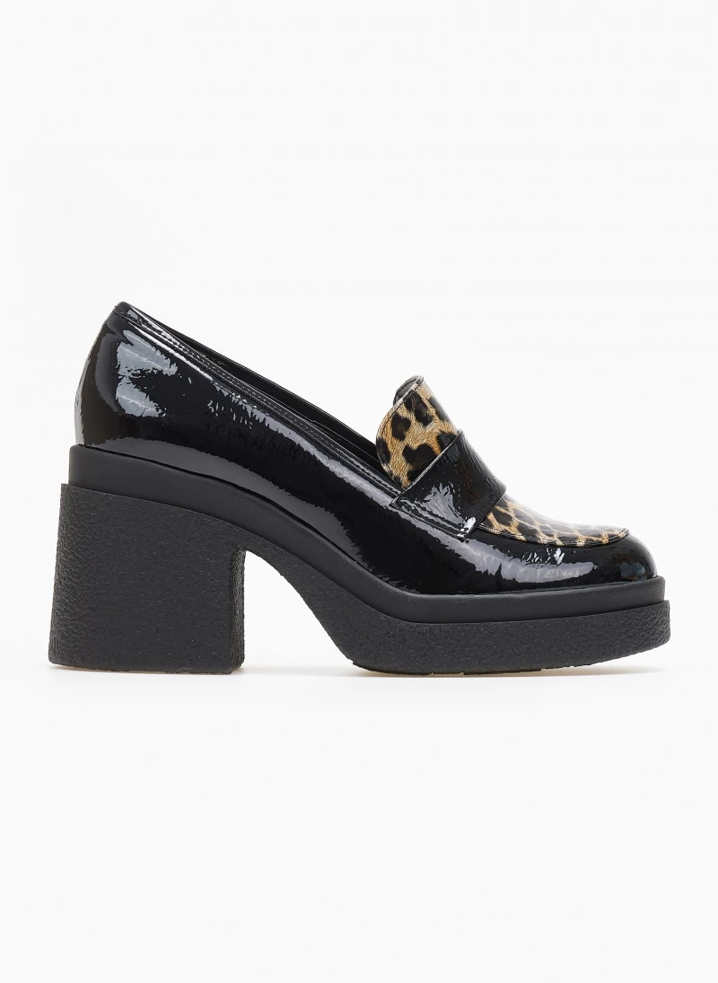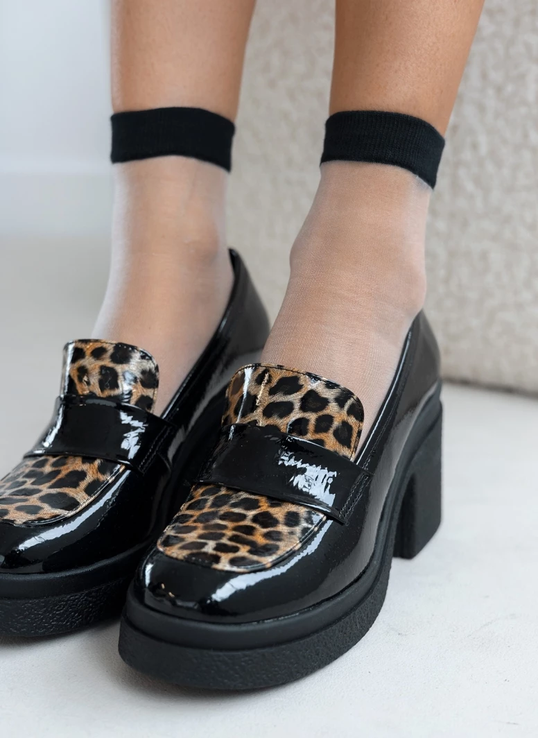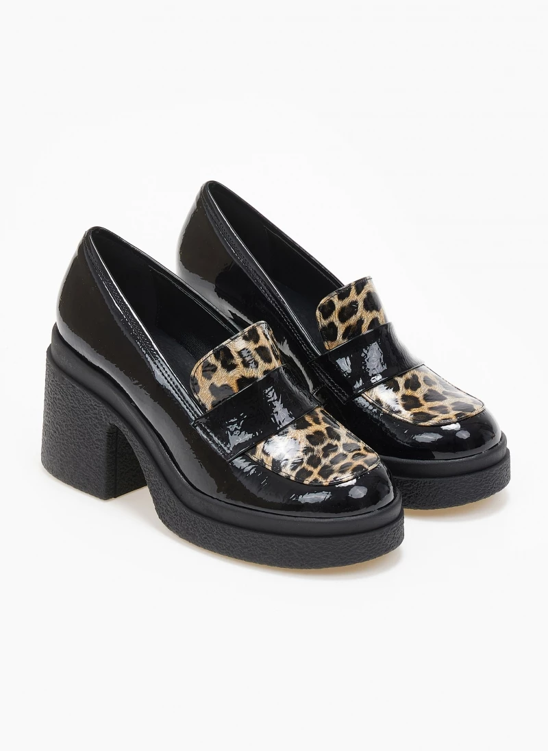 Loafers λουστρίνι με animal print στη μπροστινή πλευρά. Έχουν κρεπ σόλα και χοντρό τακούνι. Δερμάτινος πάτος. Ελληνικής κατασκευής.