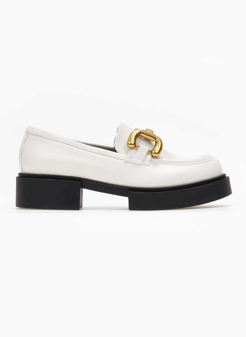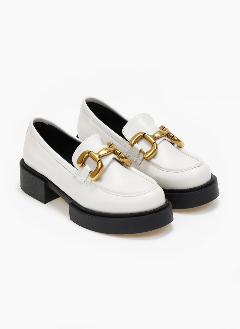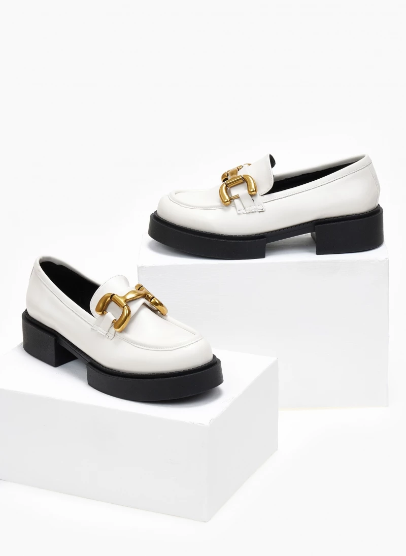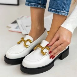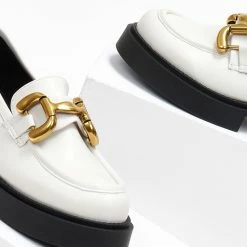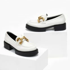 Loafers estil. Έχουν εξωτερική ραφή στη μπροστινή πλευρά. Μεταλλικό διακοσμητικό στο επάνω μέρος. Δερμάτινος πάτος. Ελληνικής κατασκευής.