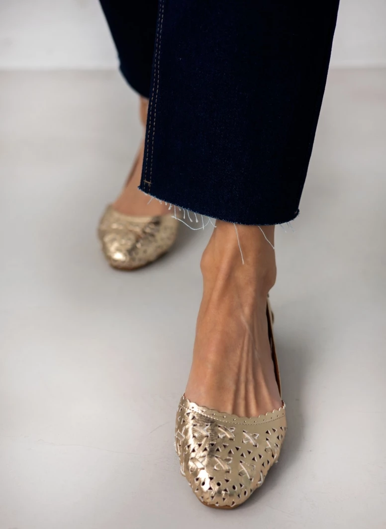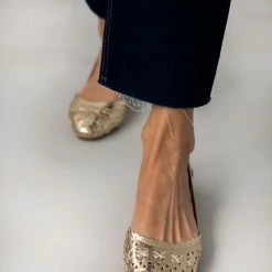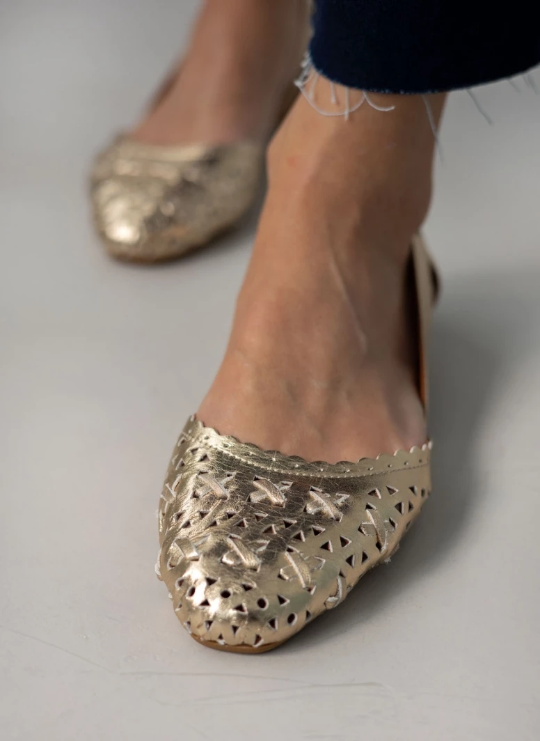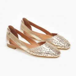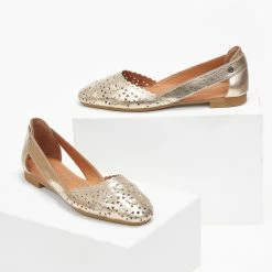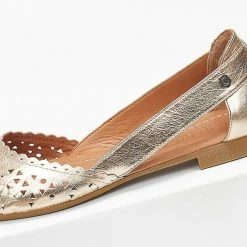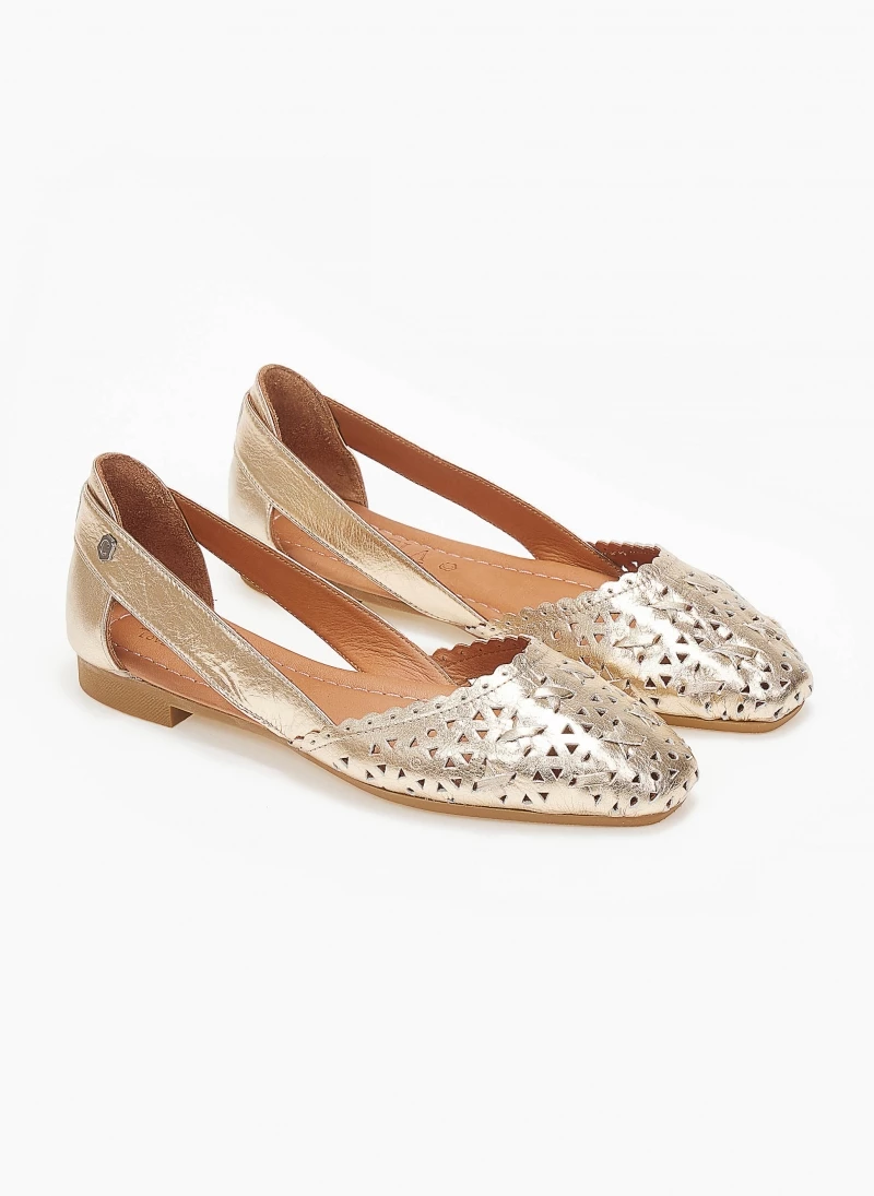 Μπαλαρίνες δερμάτινες CARMELA. Έχουν διάτρητο σχέδιο. Ανοιχτά πλαϊνά με διακριτικό μεταλλικό στοιχείο. Δερμάτινος πάτος. Σόλα μαλακή από λαστιχο.