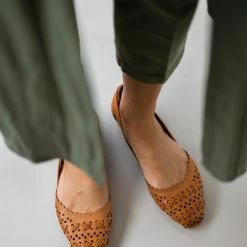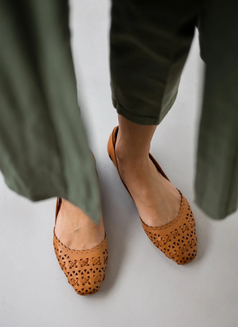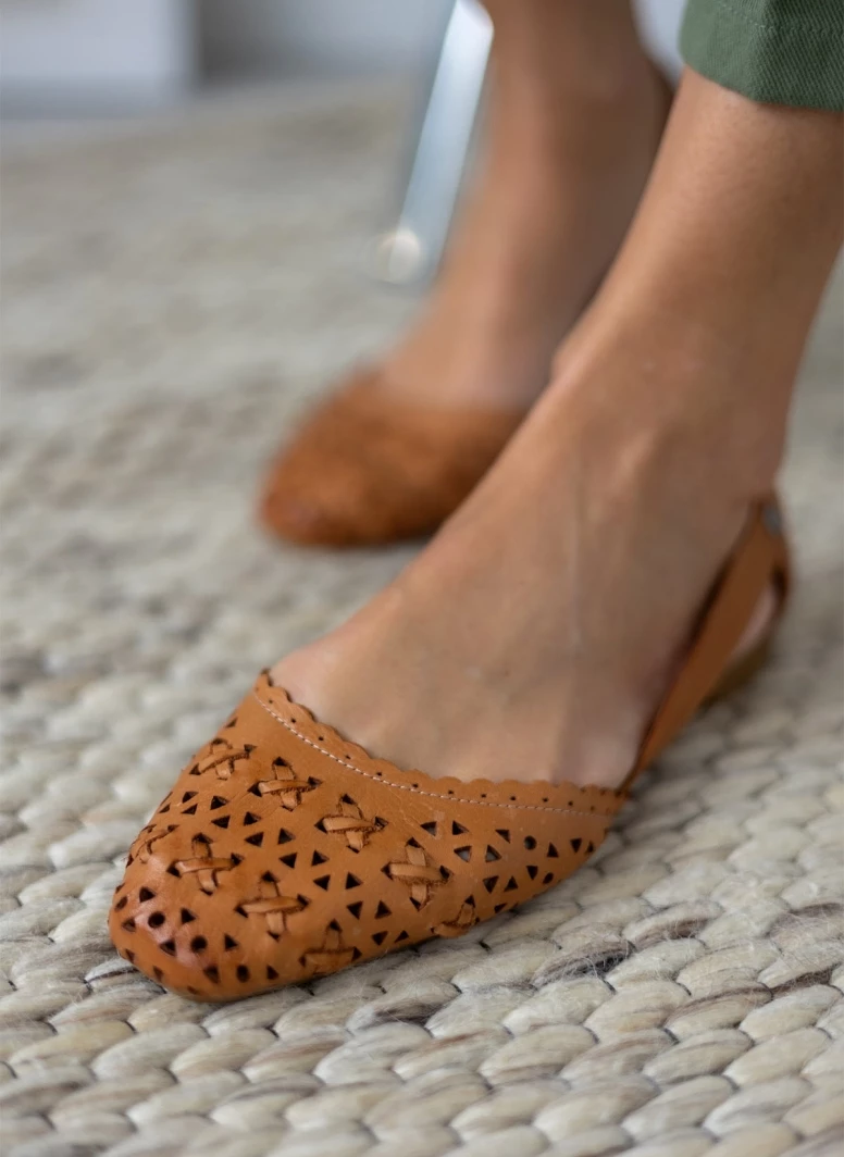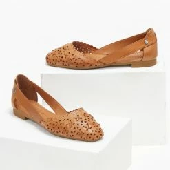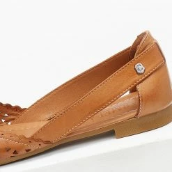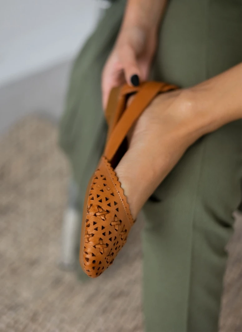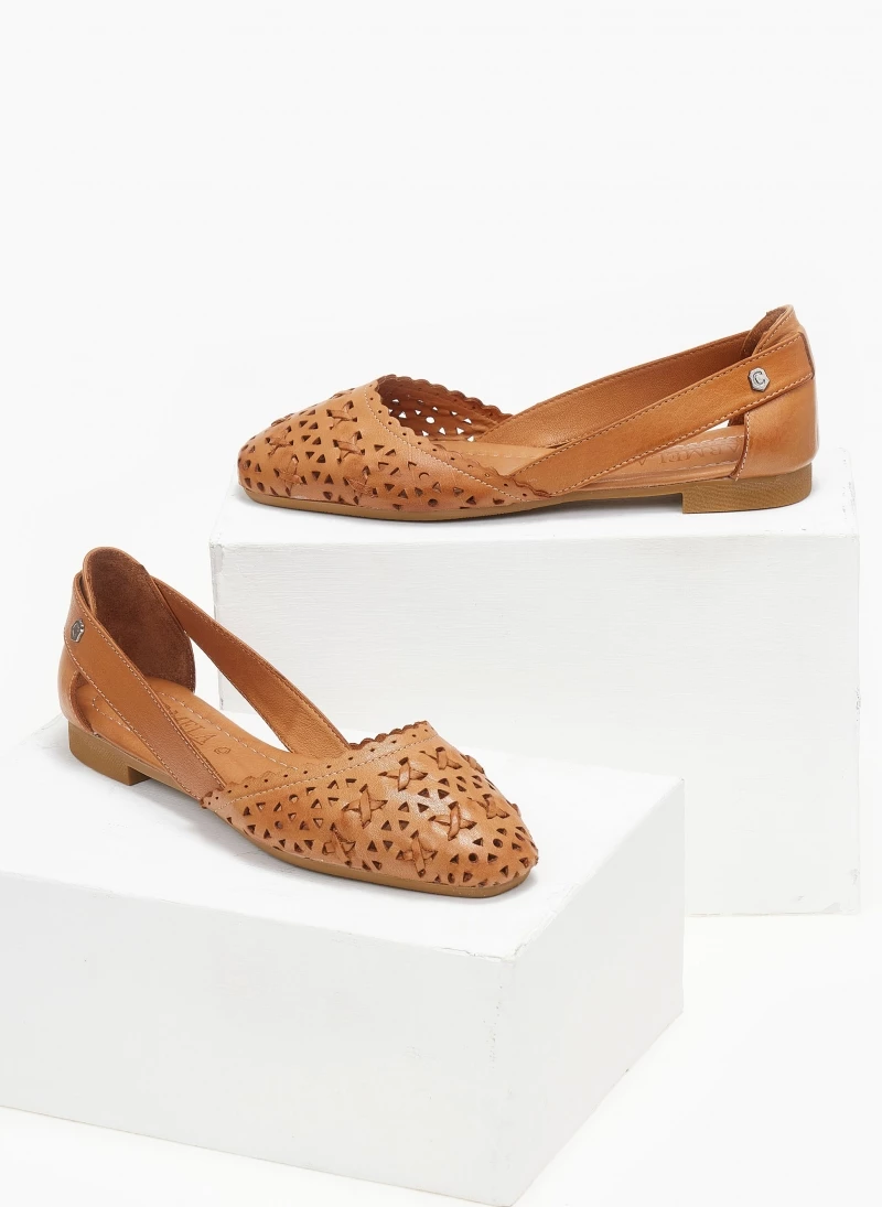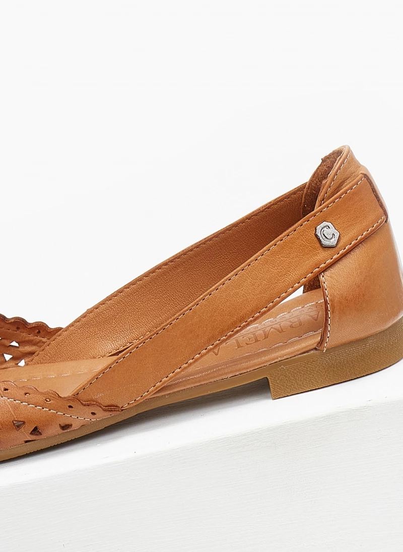 Μπαλαρίνες δερμάτινες CARMELA. Έχουν διάτρητο σχέδιο. Ανοιχτά πλαϊνά με διακριτικό μεταλλικό στοιχείο. Δερμάτινος πάτος. Σόλα μαλακή από λαστιχο.