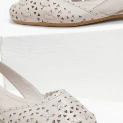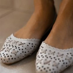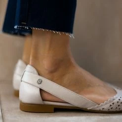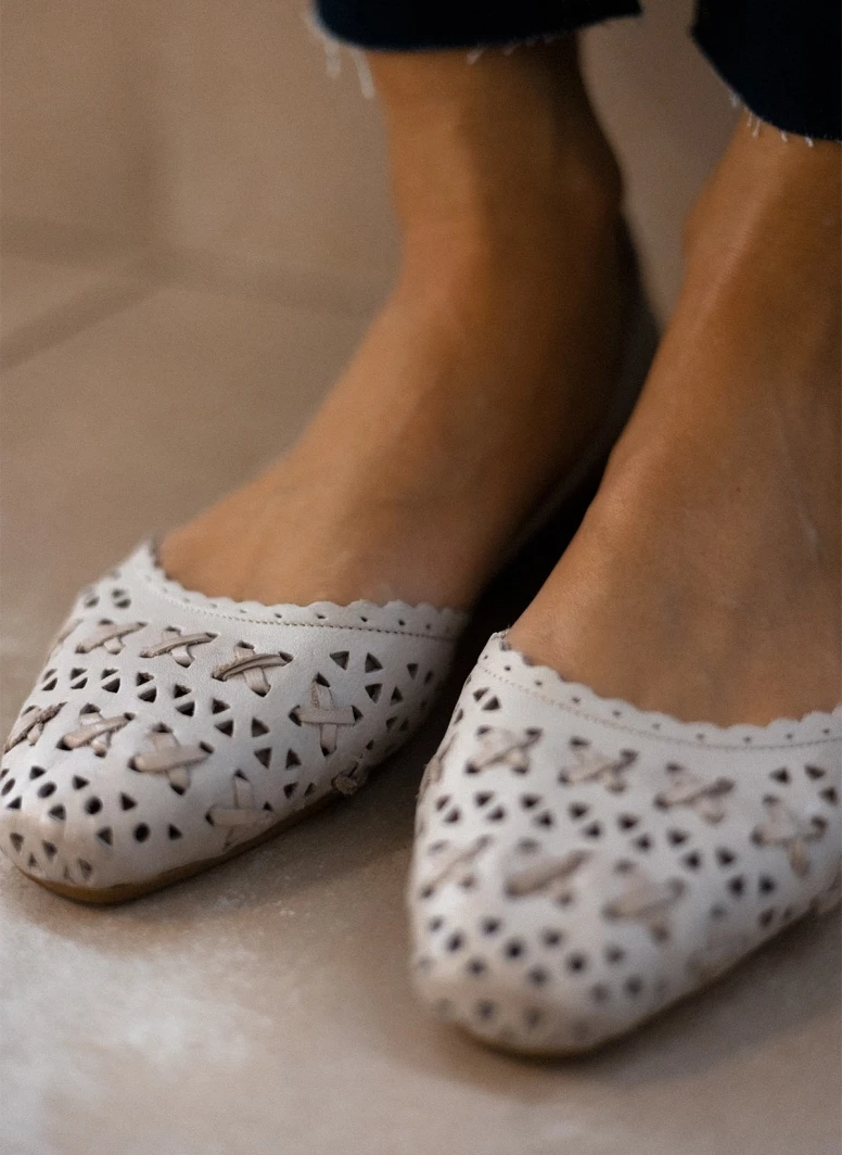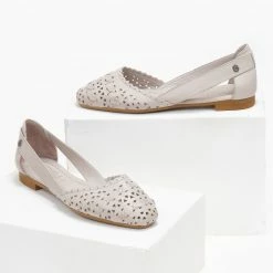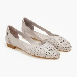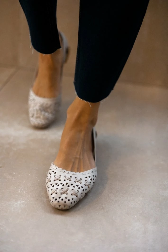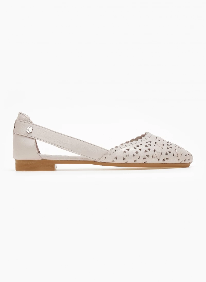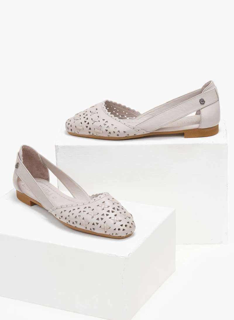 Μπαλαρίνες δερμάτινες CARMELA. Έχουν διάτρητο σχέδιο. Ανοιχτά πλαϊνά με διακριτικό μεταλλικό στοιχείο. Δερμάτινος πάτος. Σόλα μαλακή από λαστιχο.