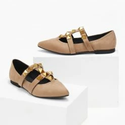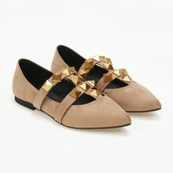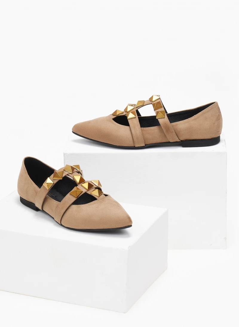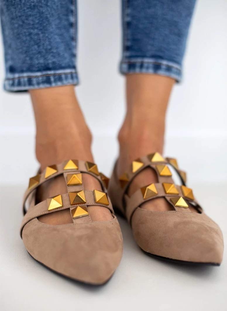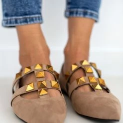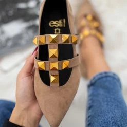 Mules μυτερά suede estil. Έχουν σχέδιο με μεταλλικά τρουκς στο επάνω μέρος. Δερμάτινος πάτος. Ελληνικής κατασκευής.
