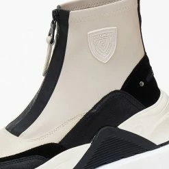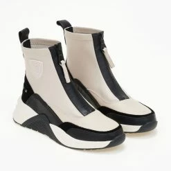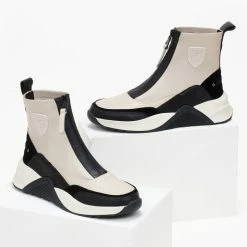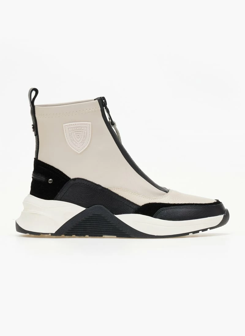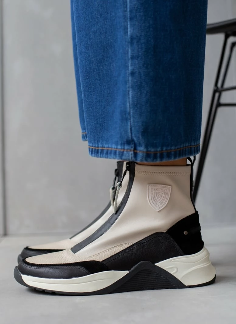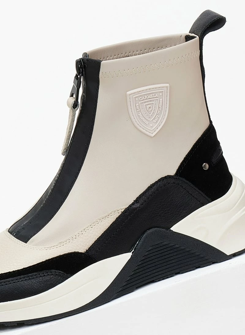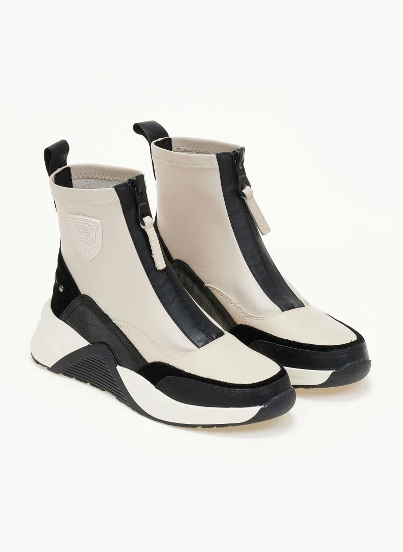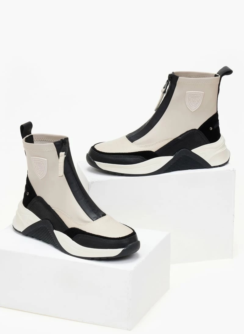 Sneakers μποτάκια δερμάτινα σε συνδυασμό χρωμάτων. Έχουν ελαστικό τμήμα στο κουτεπιέ και το ύψος του αστραγάλου. Κλείνουν με φερμουάρ στη μπροστινή πλευρά. Δερμάτινος πάτος. Chunky σόλα με σχέδιο.