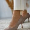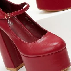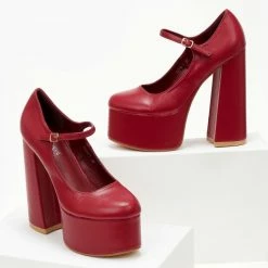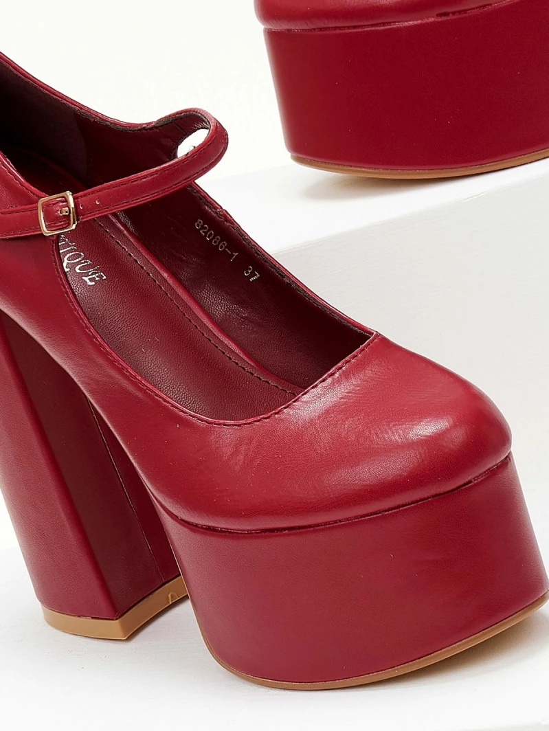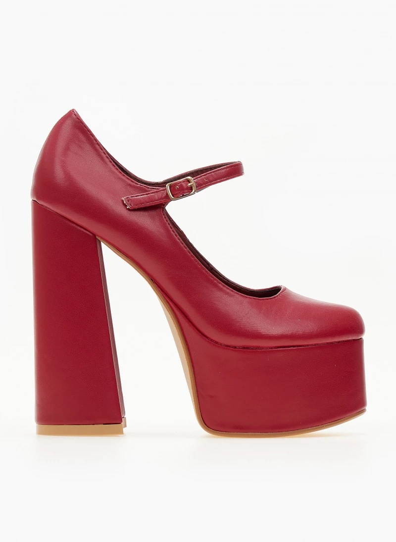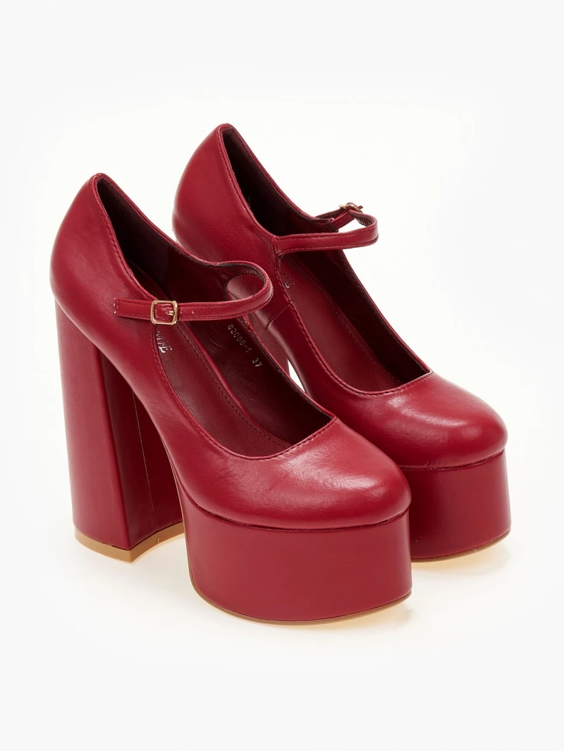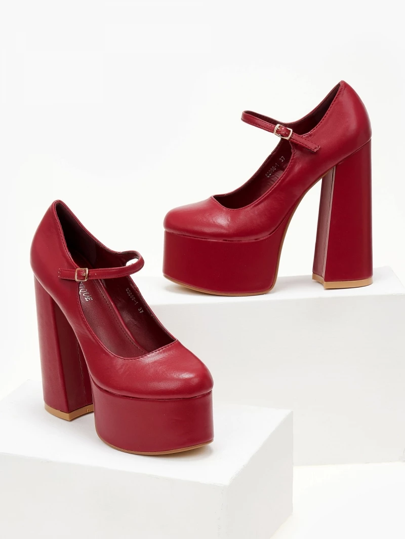 Γόβες platform Με ψηλή φιάπα και χοντρό τακούνι. Στρογγυλή γραμμή. Δένουν με μπαρέτα στο ύψος του κουτεπιέ.