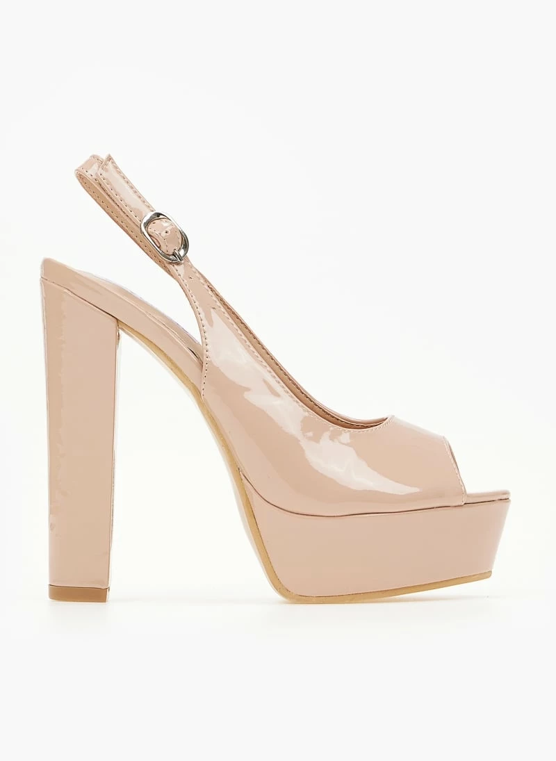 Γόβες peep toe λουστρίνι με ψηλό χοντρό τακούνι και φιάπα.Δένουν στο πλάι με μικρή αγράφα.