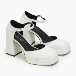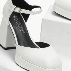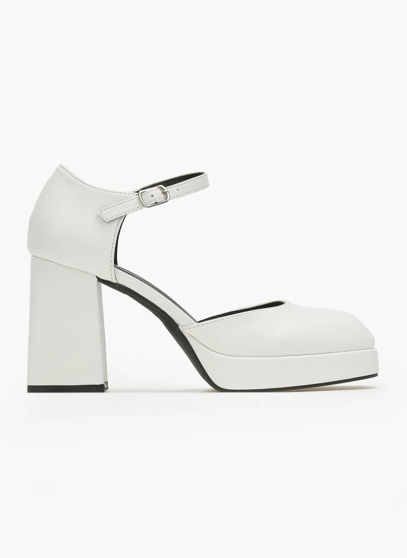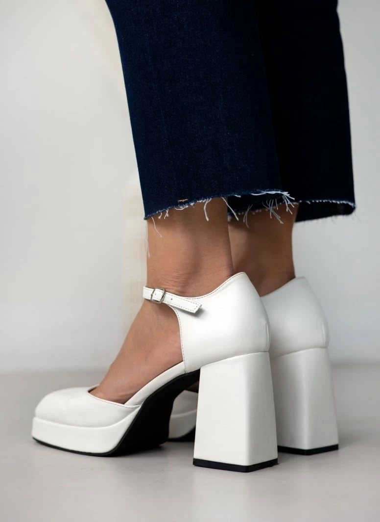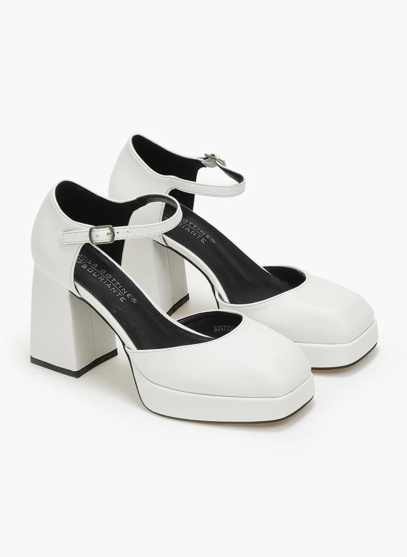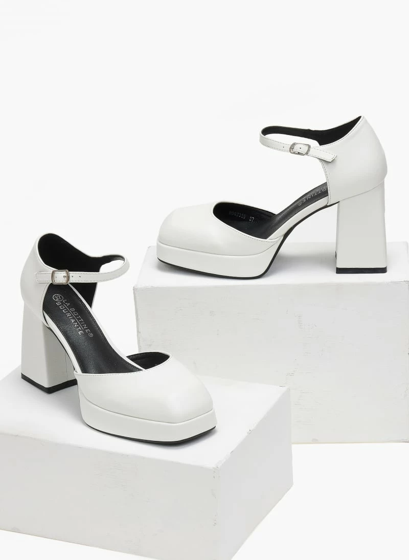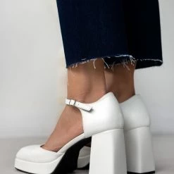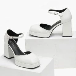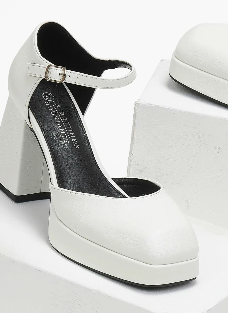 Γόβες με ανοίγματα στο πλάι και κλειστή φτέρνα. Δένουν με μπαρέτα στο ύψος του αστραγάλου. Χοντρό τακούνι με φιάπα. Καρέ γραμμή.