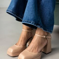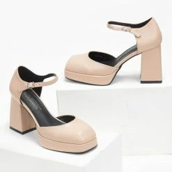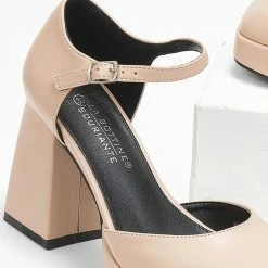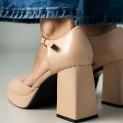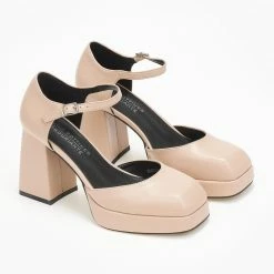 Γόβες με ανοίγματα στο πλάι και κλειστή φτέρνα. Δένουν με μπαρέτα στο ύψος του αστραγάλου. Χοντρό τακούνι με φιάπα. Καρέ γραμμή.