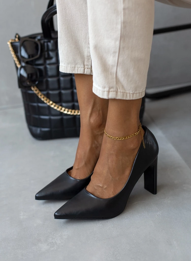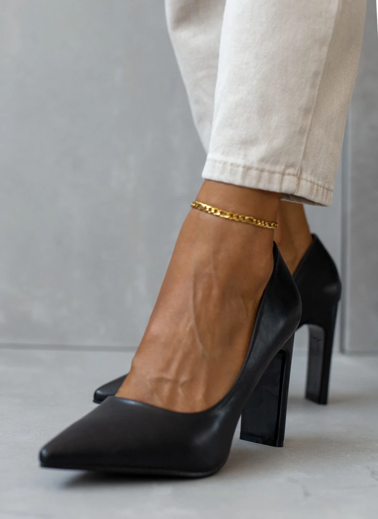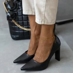 Γόβες μυτερές. Έχουν ψηλό γυαλιστερό τακούνι.