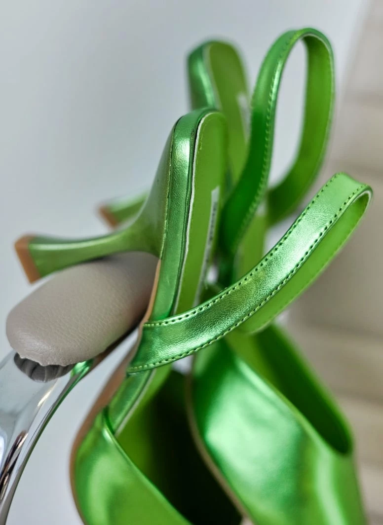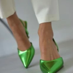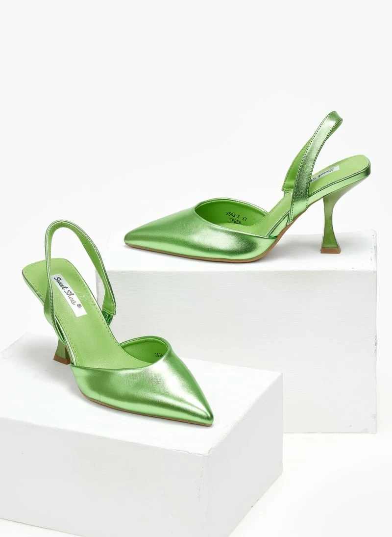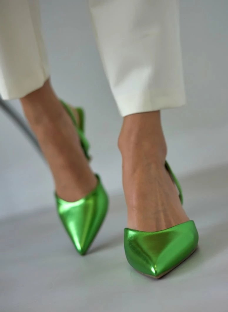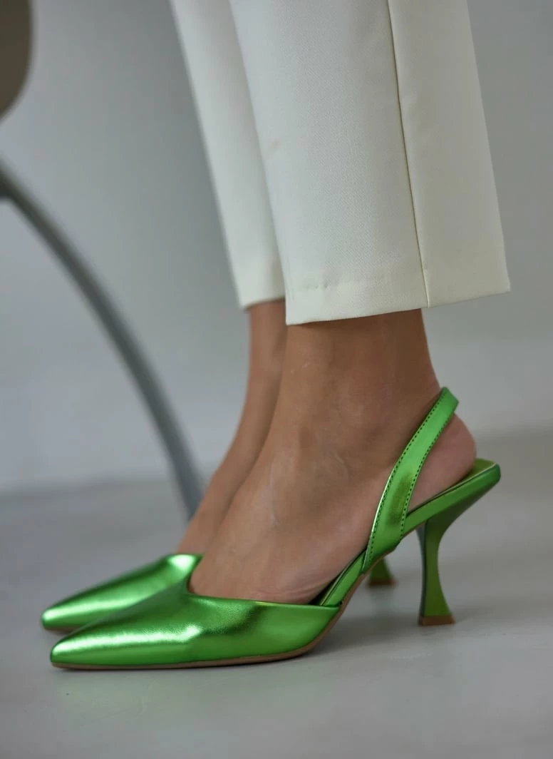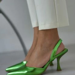 Μυτερές γόβες σε μεταλλικές αποχρώσεις. Έχουν λουράκι στο πίσω μέρος. Τακούνι σε σχήμα καμπάνα.