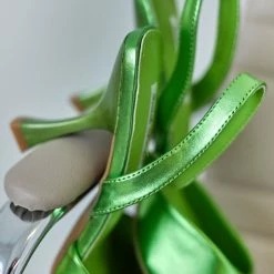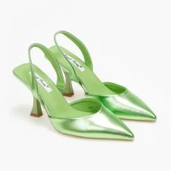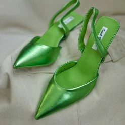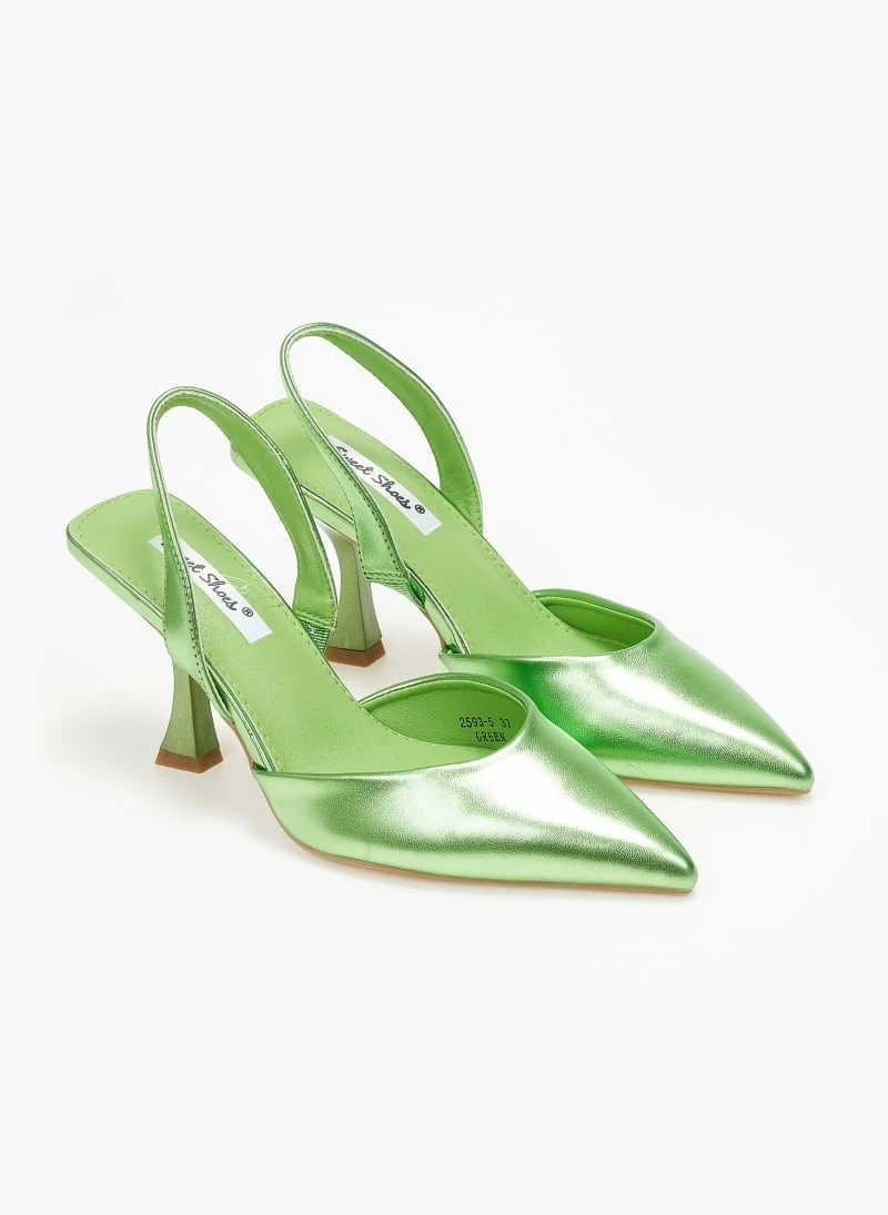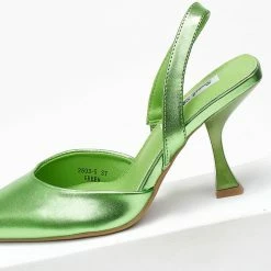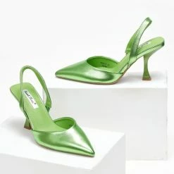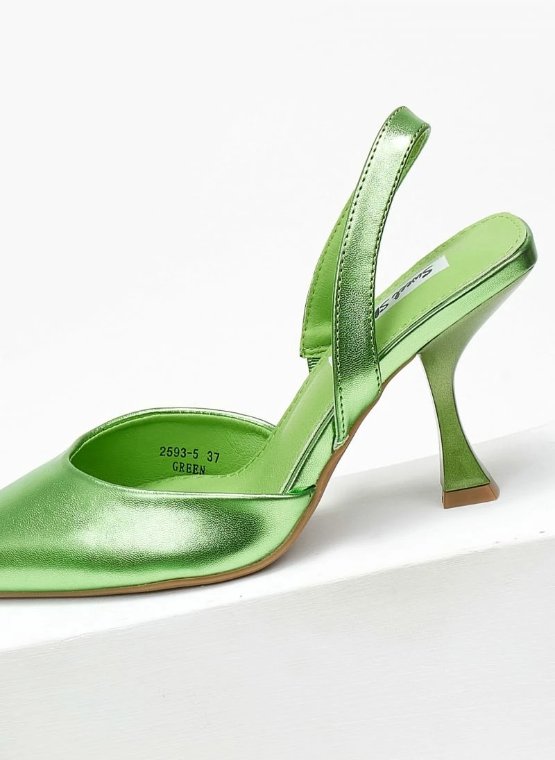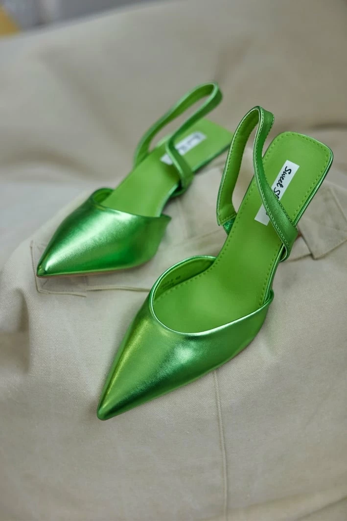 Μυτερές γόβες σε μεταλλικές αποχρώσεις. Έχουν λουράκι στο πίσω μέρος. Τακούνι σε σχήμα καμπάνα.