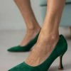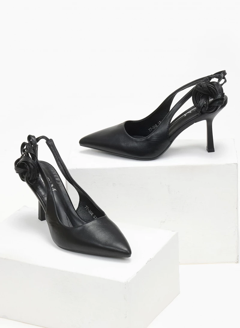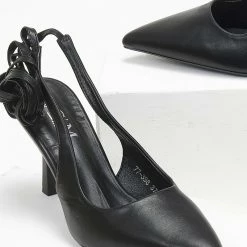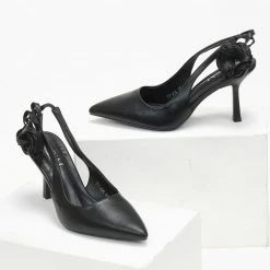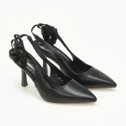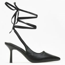 Γόβες μυτερές με λεπτό τακούνι. Δένουν με κορδόνια στη γάμπα.