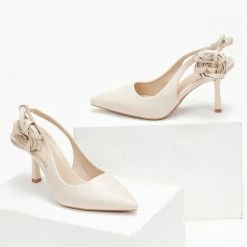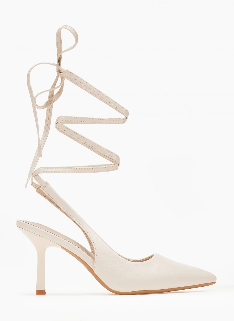 Γόβες μυτερές με λεπτό τακούνι. Δένουν με κορδόνια στη γάμπα.
