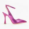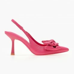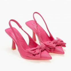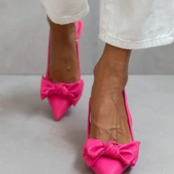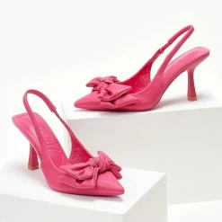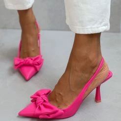 Γόβες ανοιχτές με oversize φιόγκο. Έχουν ελαστικό τμήμα στο λουράκι. Ψηλό λεπτό τακούνι. Μυτερή φόρμα.