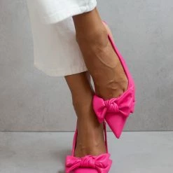 Γόβες ανοιχτές με oversize φιόγκο. Έχουν ελαστικό τμήμα στο λουράκι. Ψηλό λεπτό τακούνι. Μυτερή φόρμα.