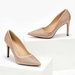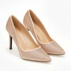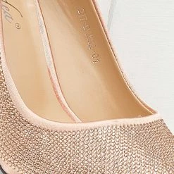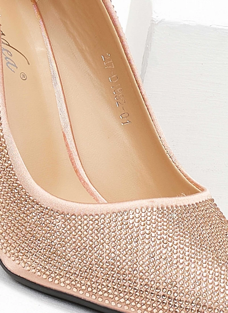 Γόβες σατέν μυτερές με strass. Έχουν ψηλό λεπτό τακούνι.