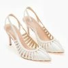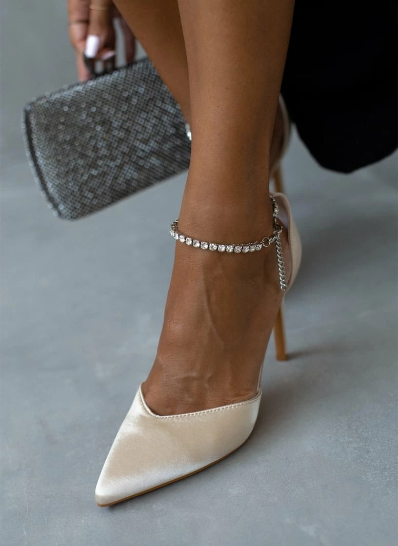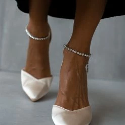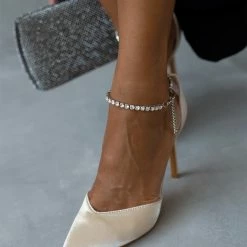 Γόβες ανοιχτές σατέν με λεπτό ψηλό τακούνι. Έχουν anklet με strass στο ύψος του αστραγάλου. Μυτερή φόρμα.