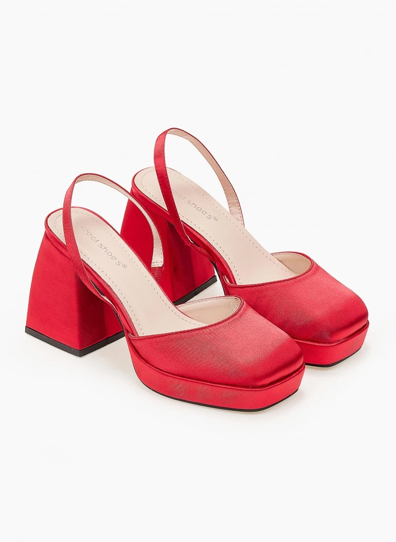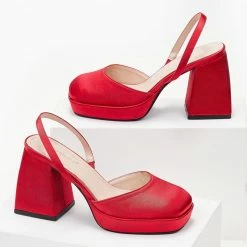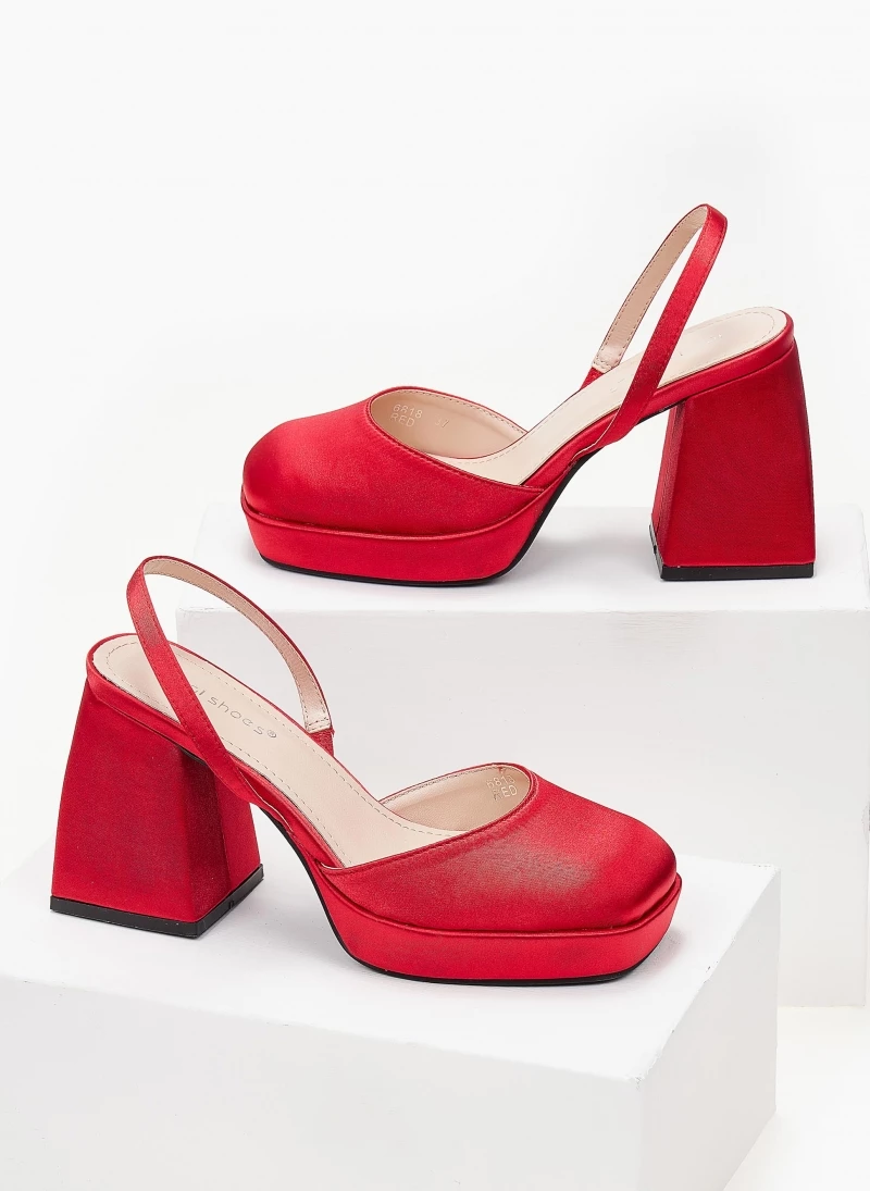 Γόβες σατέν με ψηλό χοντρό τακούνι και φιάπα.Έχουν λουράκι με διακριτικό λάστιχο στο πλάι.Καρέ γραμμή.