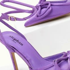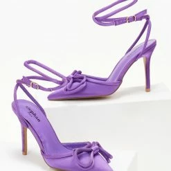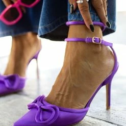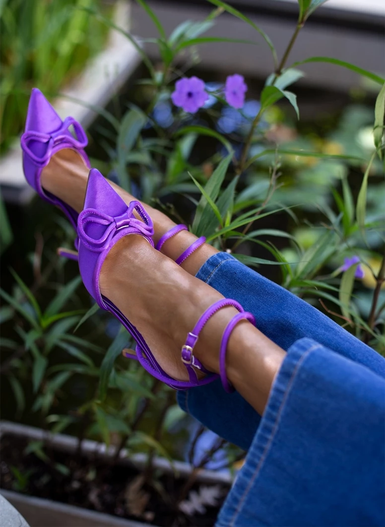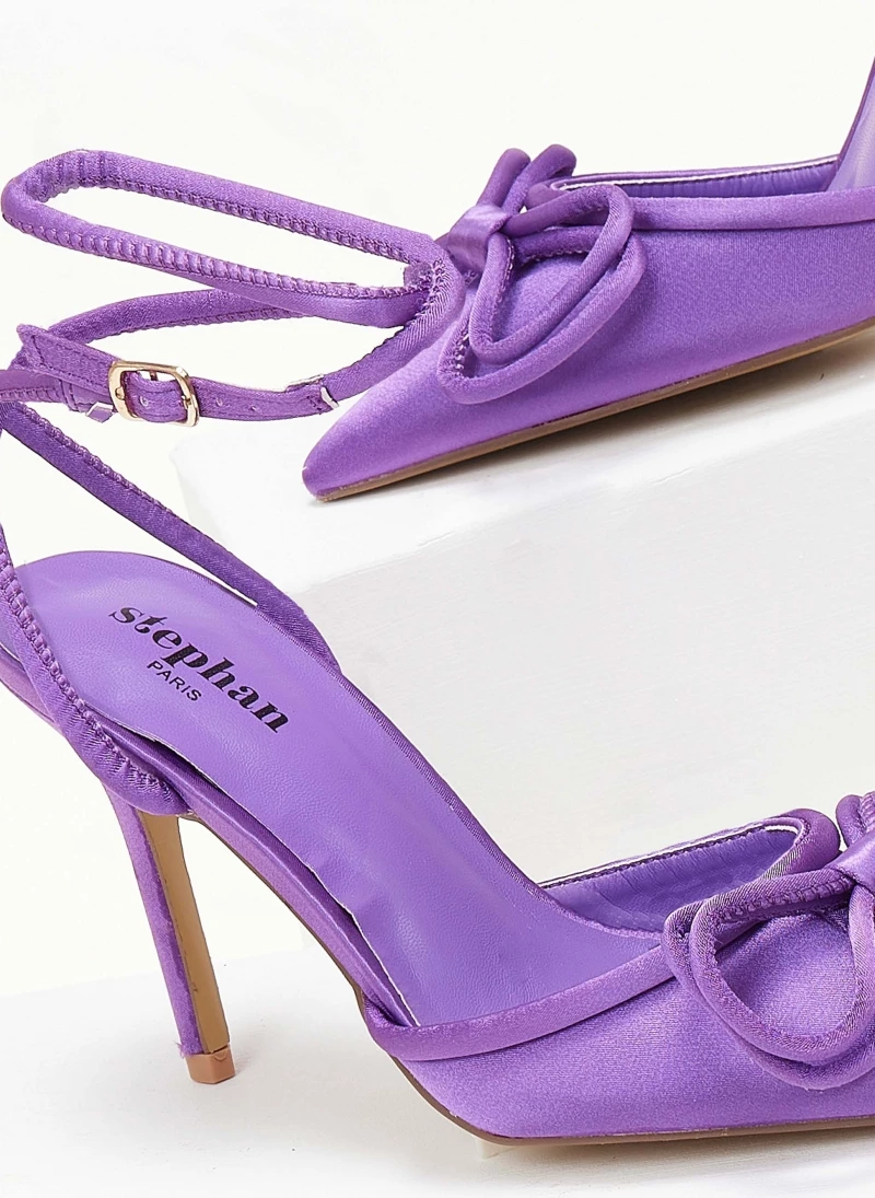 Γόβες σατέν με φιόγκο. Έχουν λεπτό ντυμένο τακούνι. Δένουν με διπλό λουράκι στο ύψος του αστραγάλου