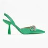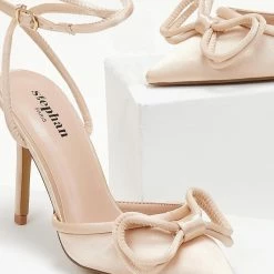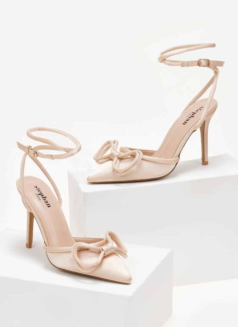 Γόβες σατέν με φιόγκο. Έχουν λεπτό ντυμένο τακούνι. Δένουν με διπλό λουράκι στο ύψος του αστραγάλου