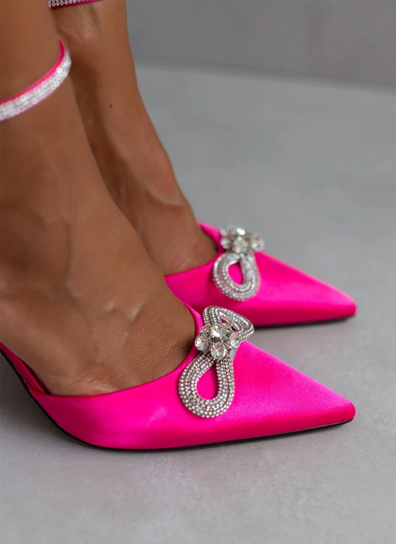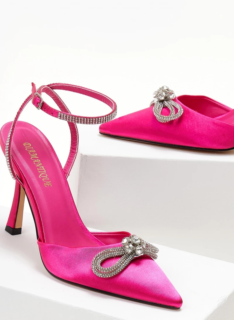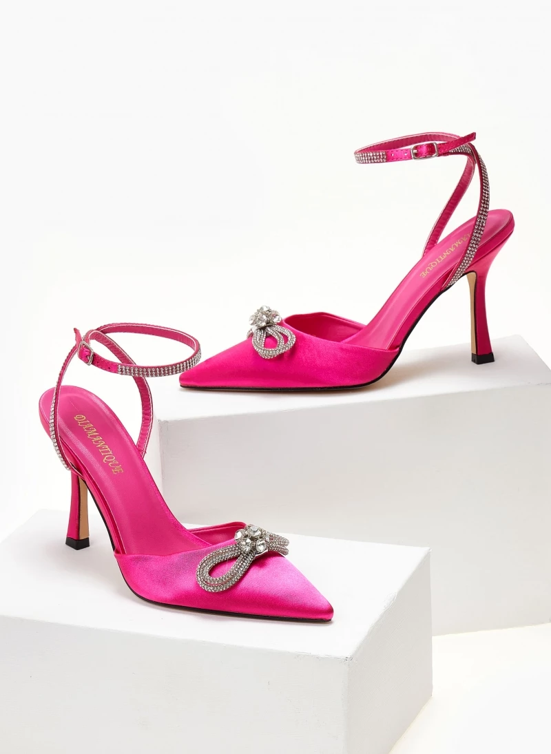 Γόβες σατέν μυτερές με strass φιόγκο. Είναι ανοιχτές στο πίσω μέρος. Δένουν με strass μπαρέτα στο ύψος του αστραγάλου. Ψηλό λεπτό τακούνι.
