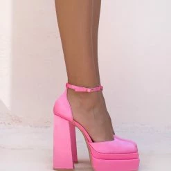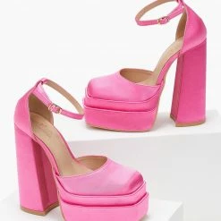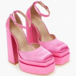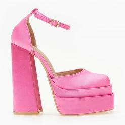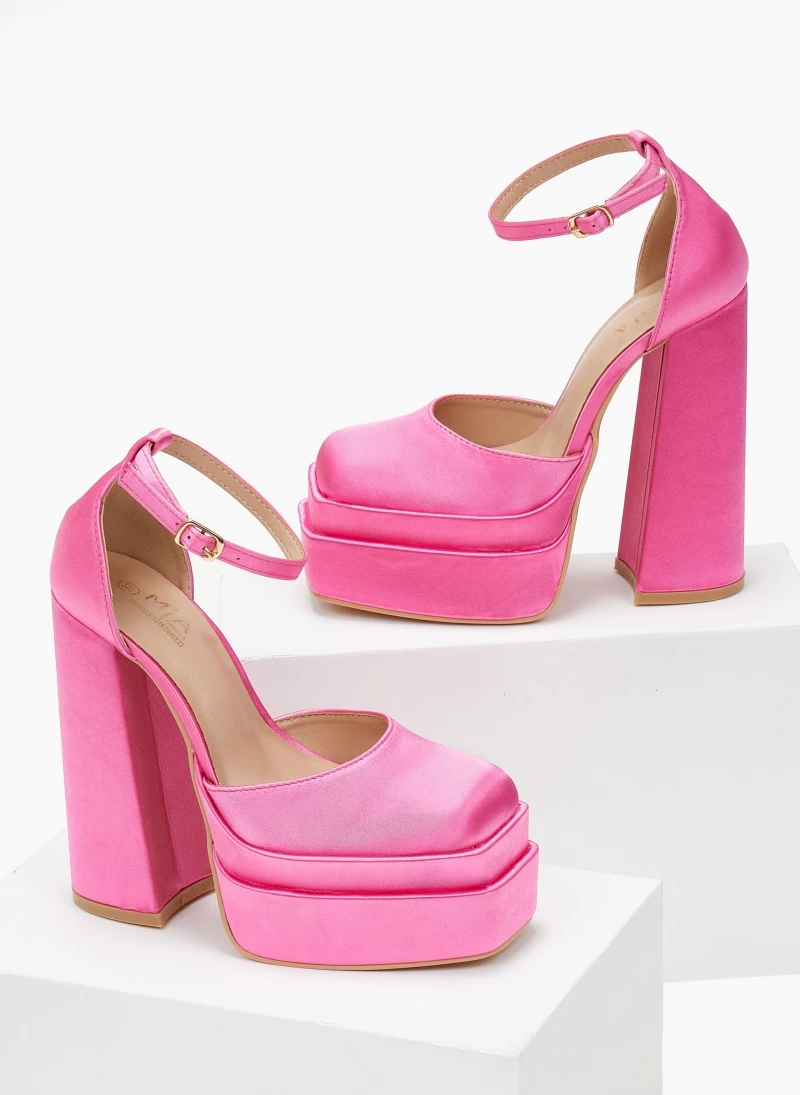 Πέδιλα σατέν με ψηλή φιάπα και χοντρό τακούνι. Έχουν κλειστή φτέρνα. Δένουν με μπαρέτα στο ύψος του αστραγάλου. Καρέ γραμμή.