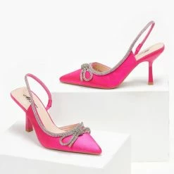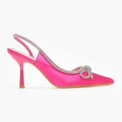 Γόβες σατέν μυτερές με λεπτό τακούνι. Έχουν σχέδιο strass φιόγκο. Το λουράκι έχει λάστιχο στην εσωτερική του πλευρά για καλύτερη εφαρμογή.